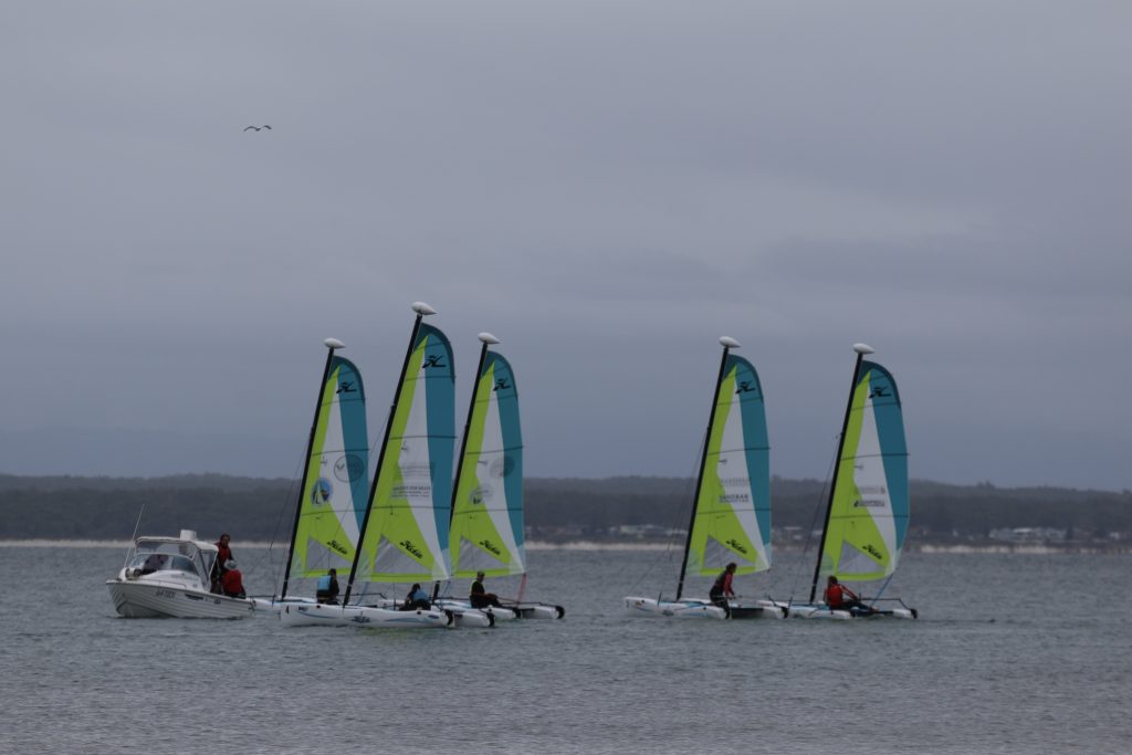 Finally, we were off! We had 7 x H14s and Matt single-handed on the H16, and racing in the Double-Handed Championship, we had Paddy & Bridg on the H16, Kiaran & Syd on the fresh H18, and Egbert & Helen on the Nacra 5.8.