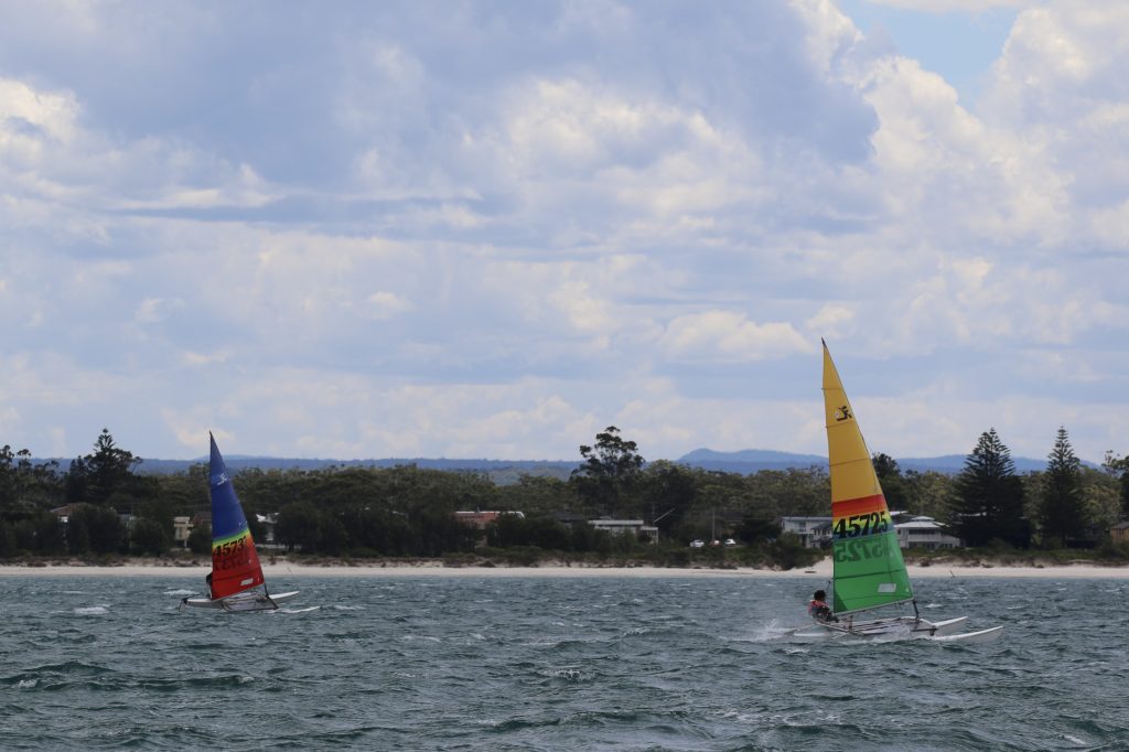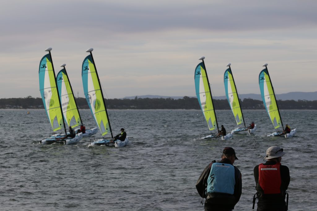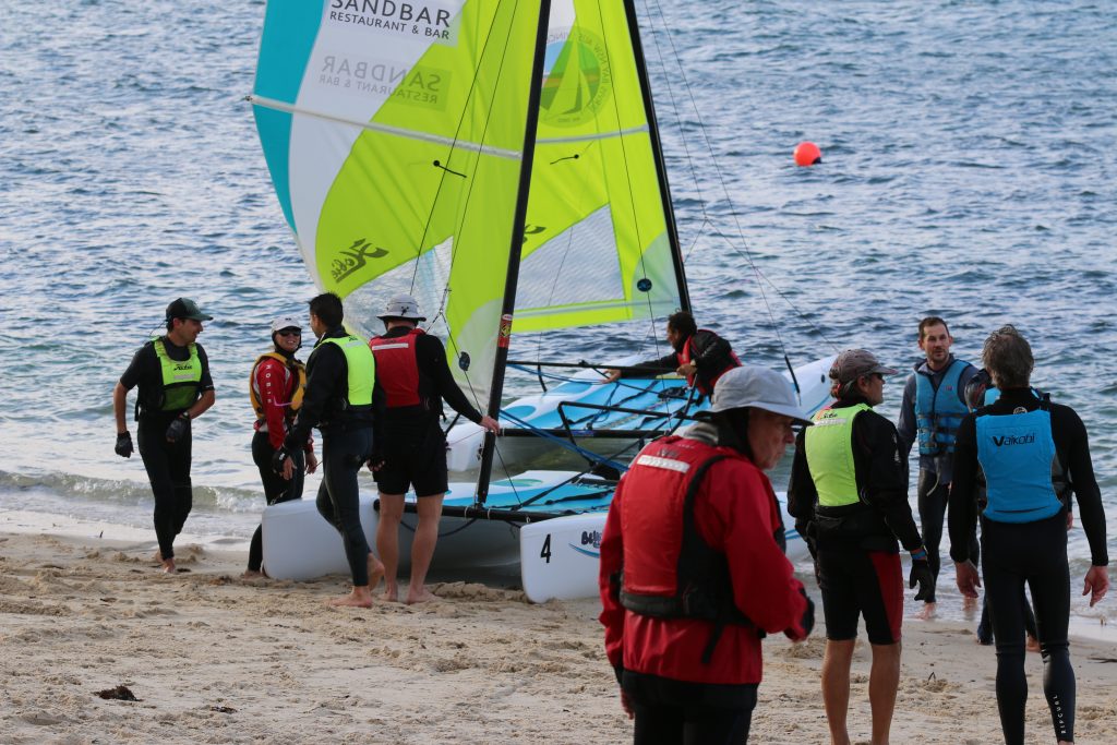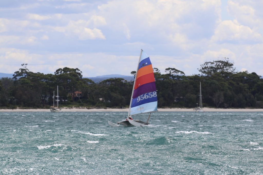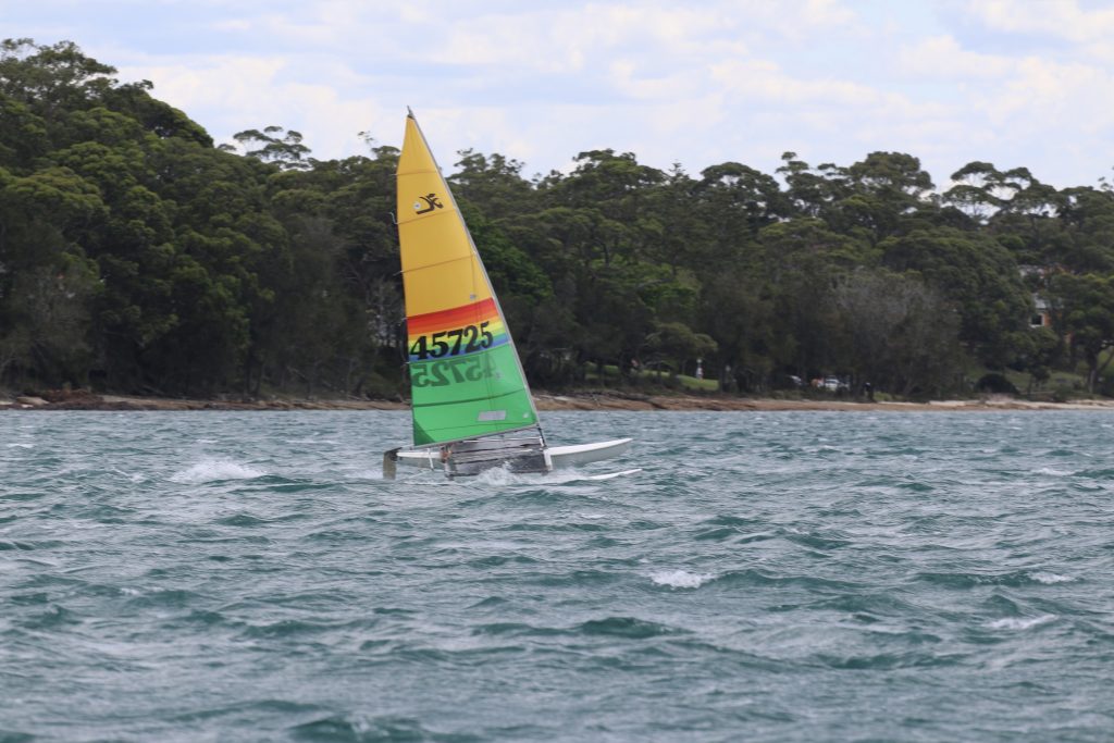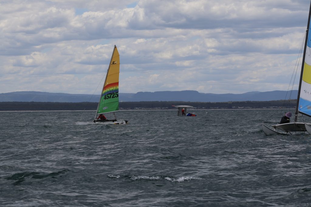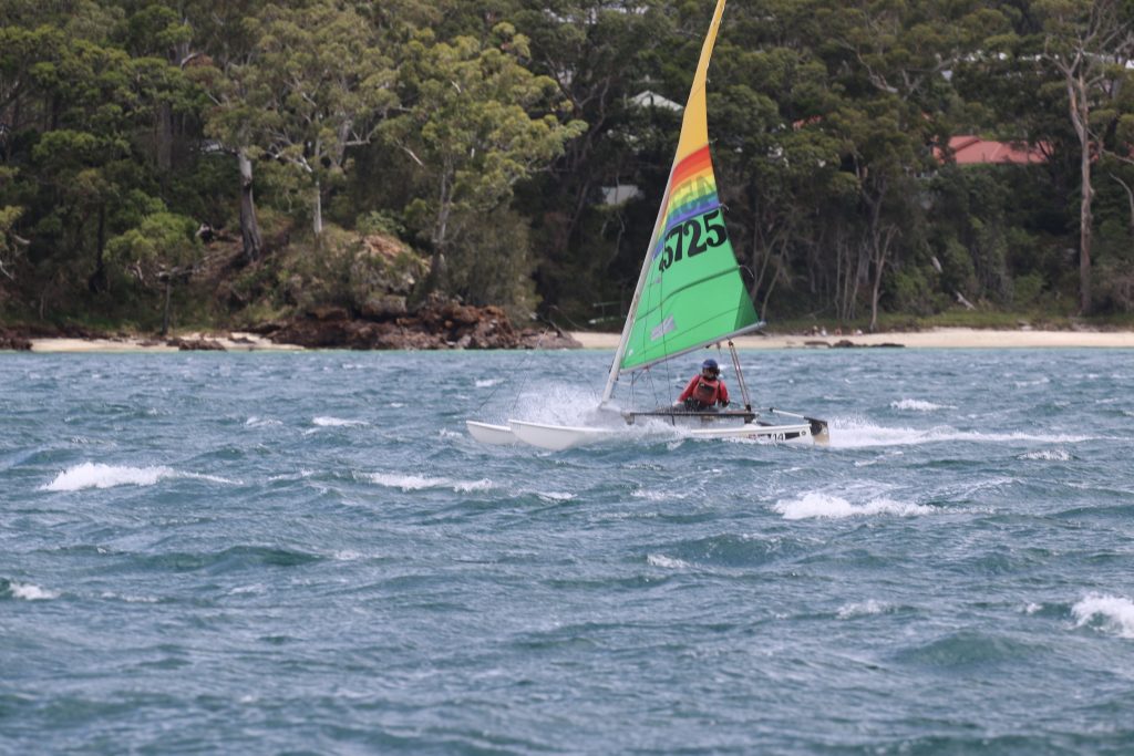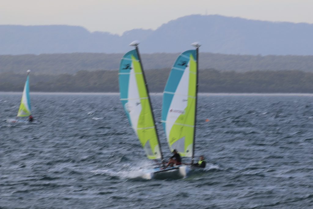 The fleet consisted of Marc & Liana on the lone 16, then Joel, River, & Evan on the Dragoon, and Rennie & Mel on the Wave. Jezza, Macca, Steve, Bridget, Adrian, & Dobbo were on 14s, and Bryn dusted off Sur Ganji to rejoin the regulars. The second session, after lunch, hosted three races, with dwindling numbers of sailors as the gusts picked them off one by one.