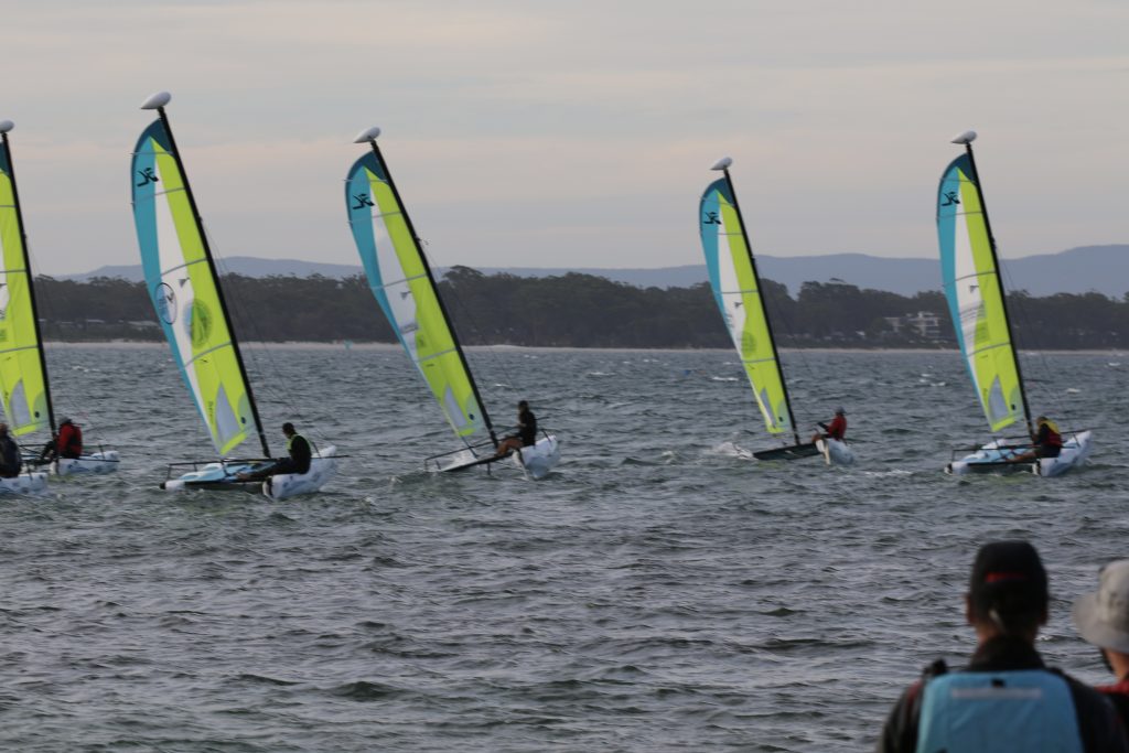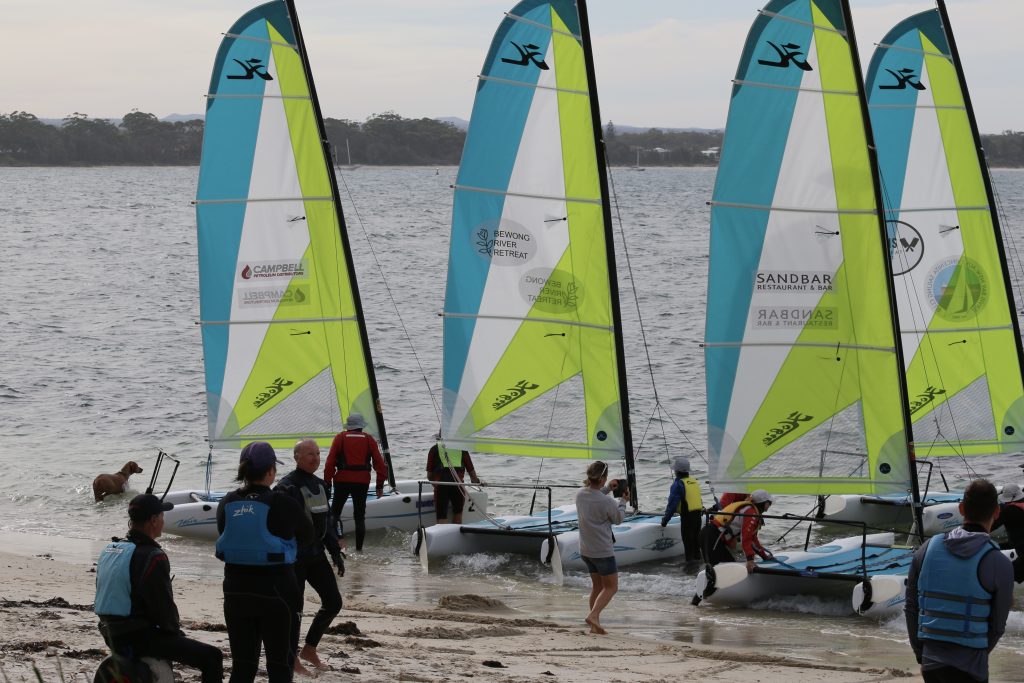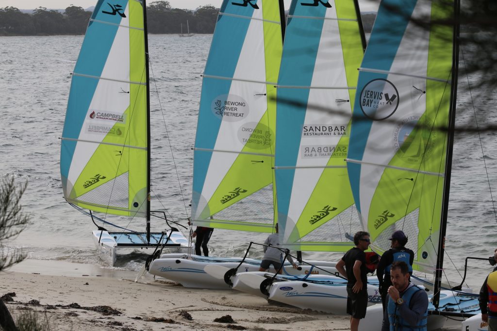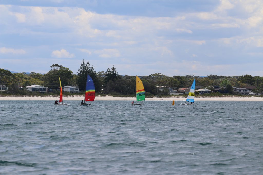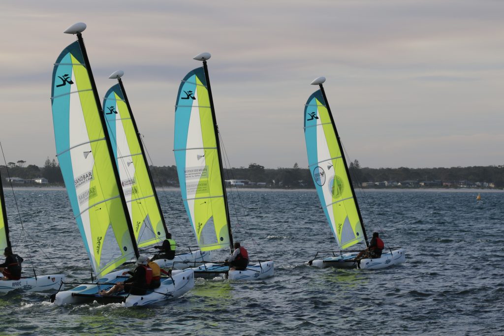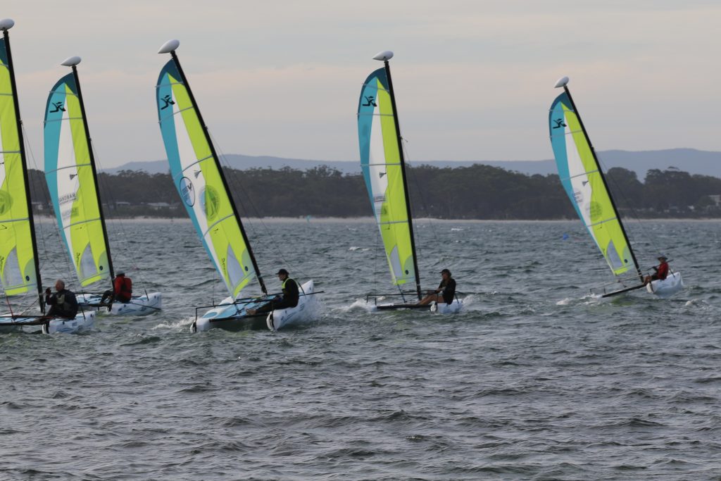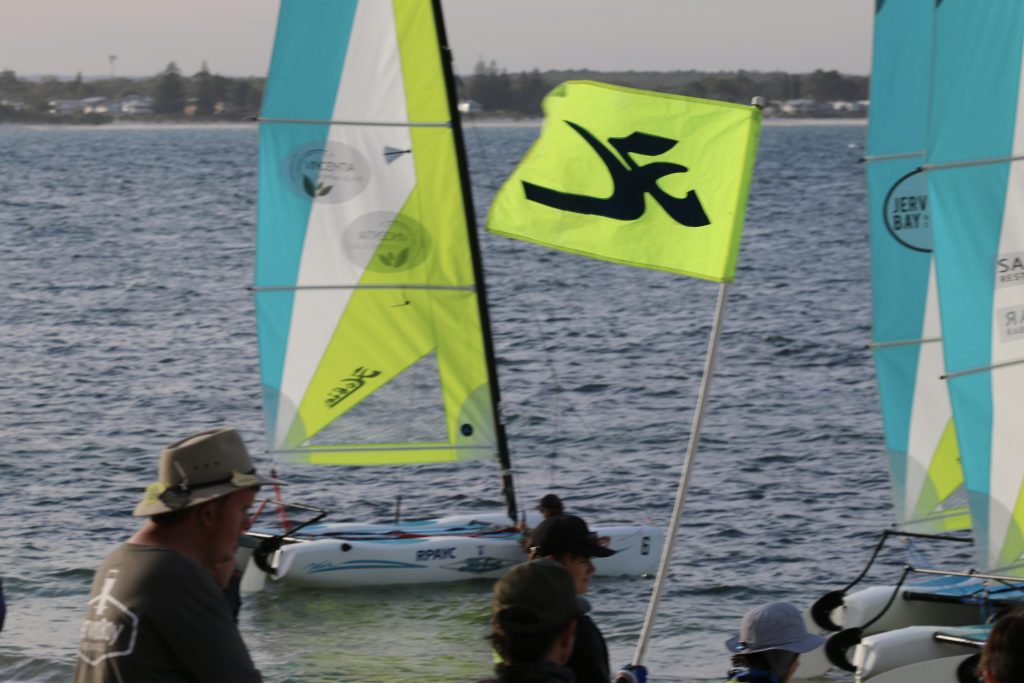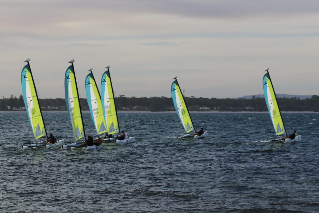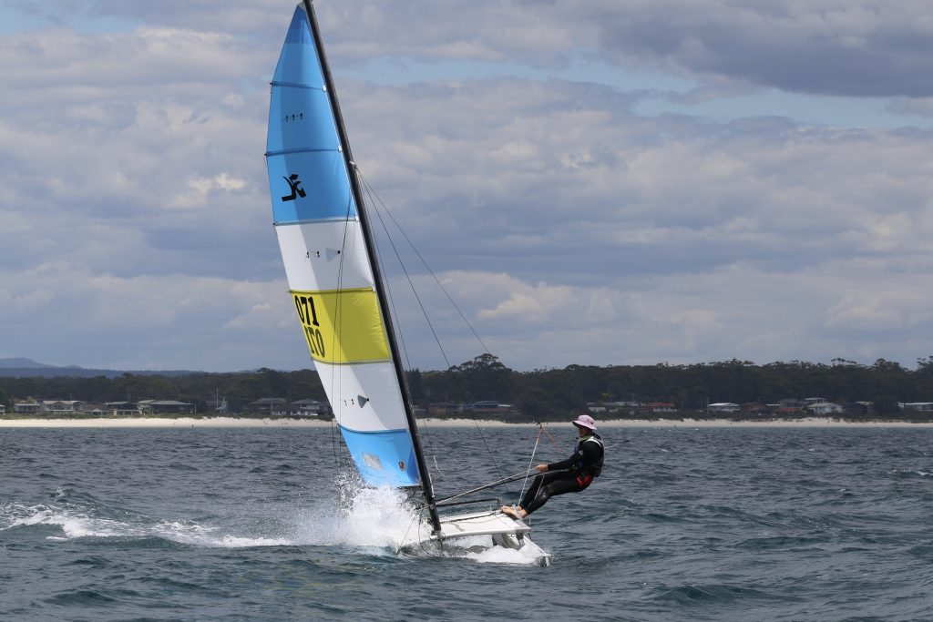 The fleet consisted of Marc & Liana on the lone 16, then Joel, River, & Evan on the Dragoon, and Rennie & Mel on the Wave. Jezza, Macca, Steve, Bridget, Adrian, & Dobbo were on 14s, and Bryn dusted off Sur Ganji to rejoin the regulars. The second session, after lunch, hosted three races, with dwindling numbers of sailors as the gusts picked them off one by one.