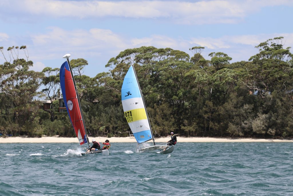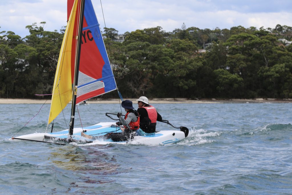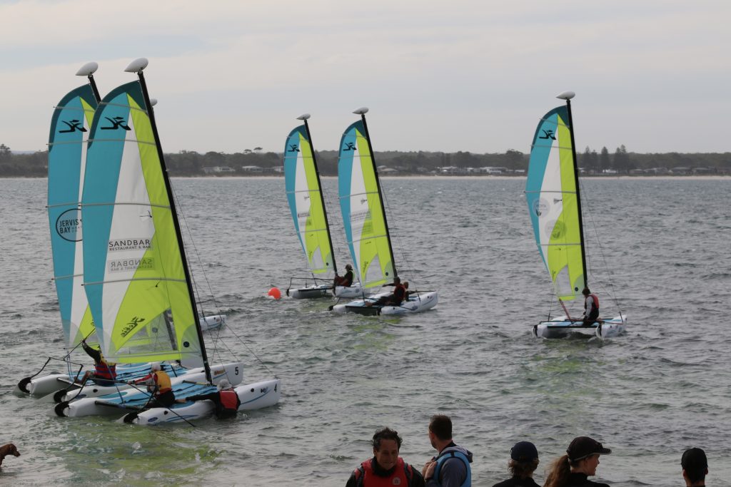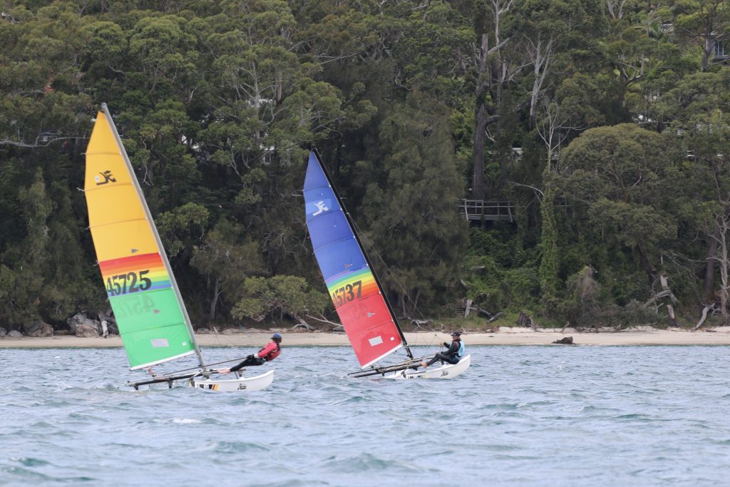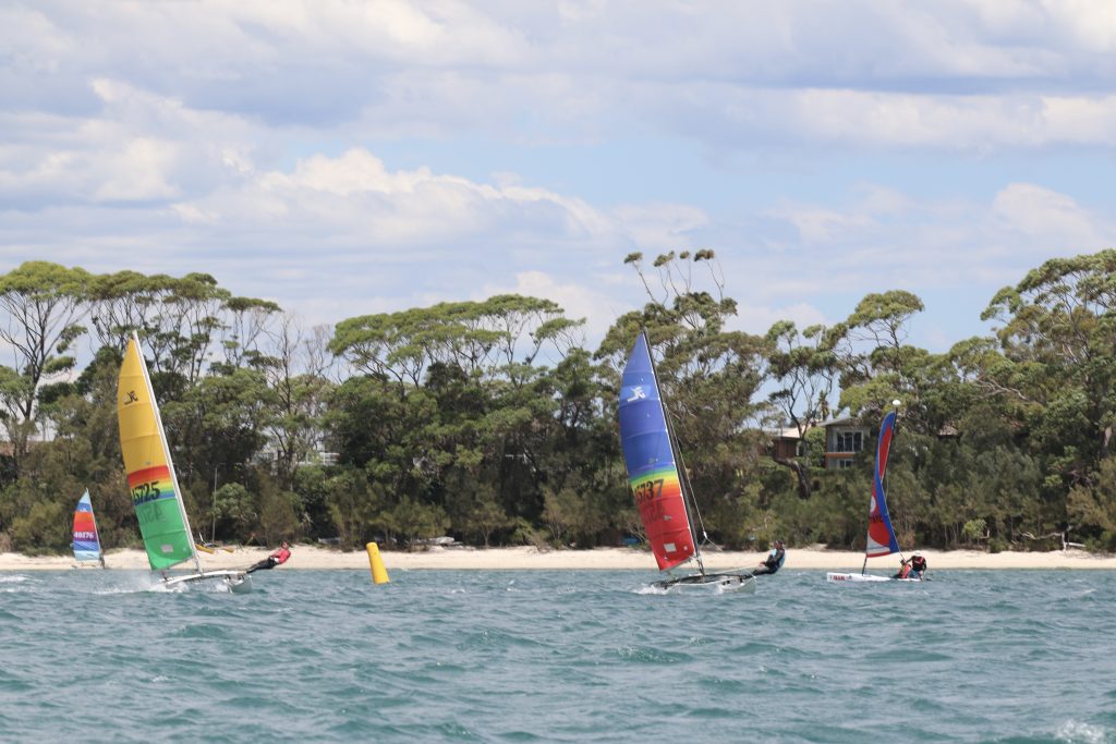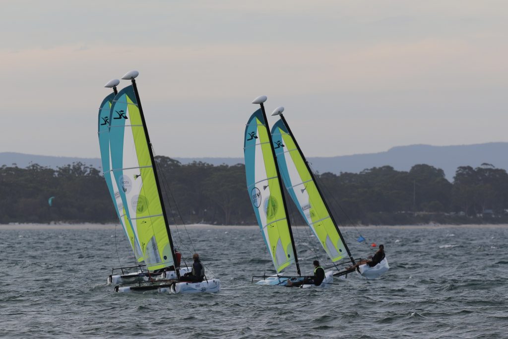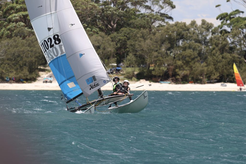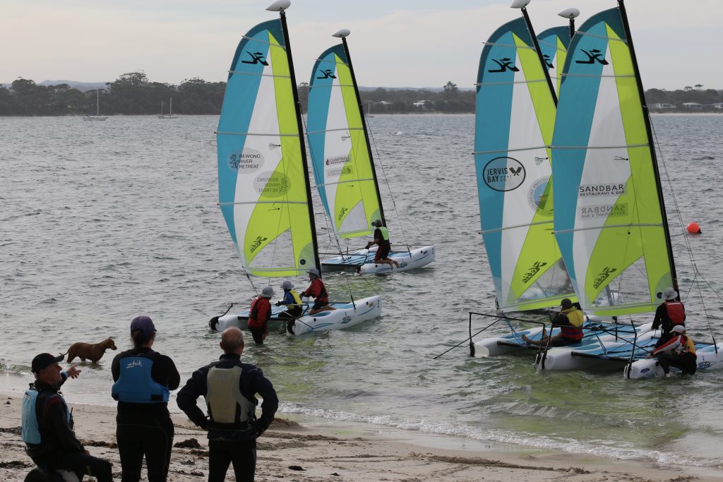 The fleet consisted of Marc & Liana on the lone 16, then Joel, River, & Evan on the Dragoon, and Rennie & Mel on the Wave. Jezza, Macca, Steve, Bridget, Adrian, & Dobbo were on 14s, and Bryn dusted off Sur Ganji to rejoin the regulars. The second session, after lunch, hosted three races, with dwindling numbers of sailors as the gusts picked them off one by one.