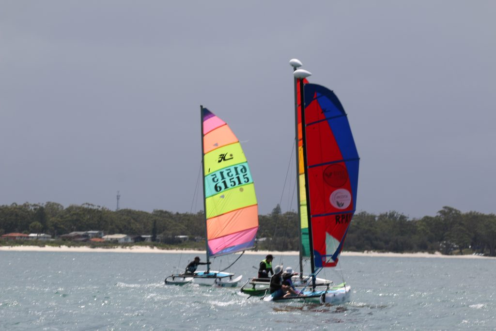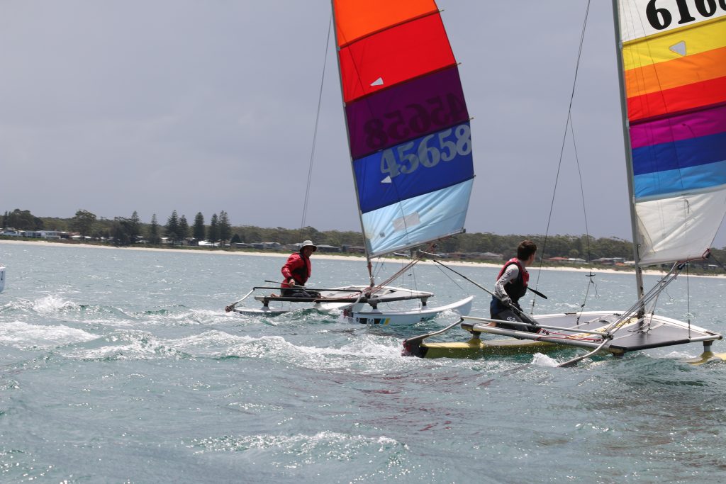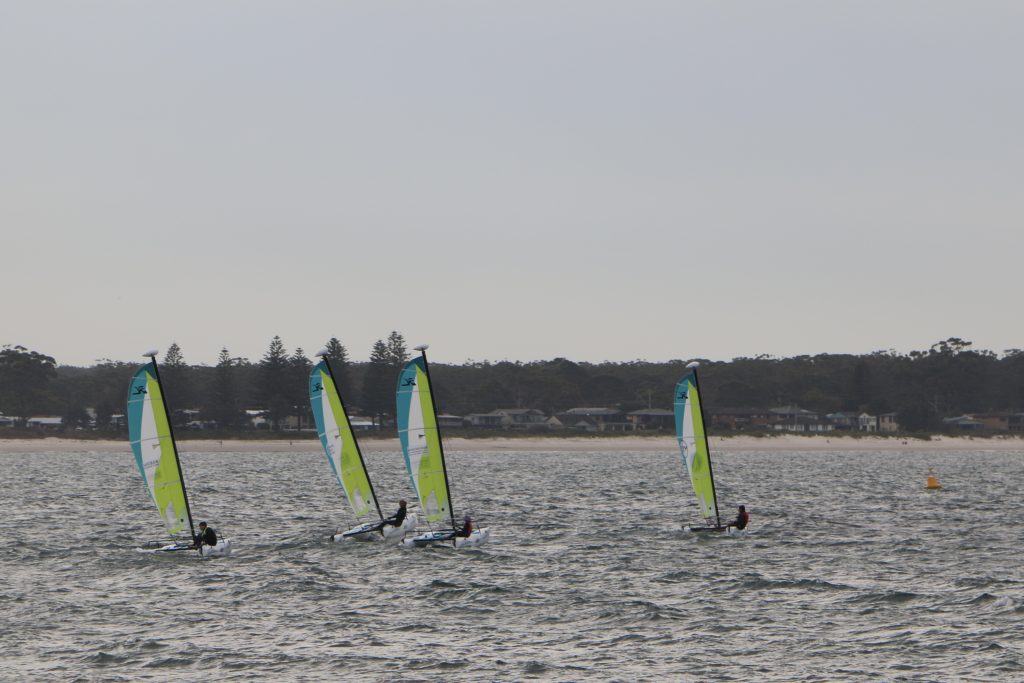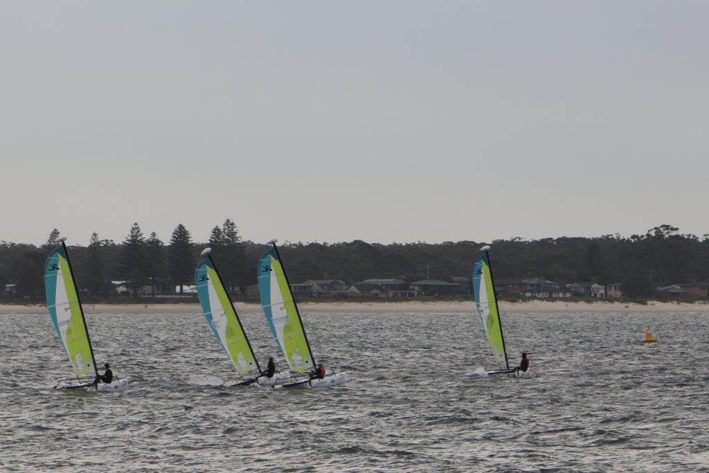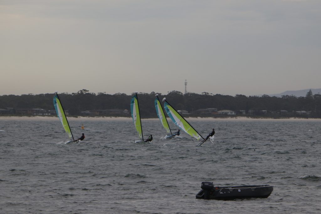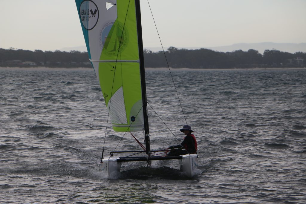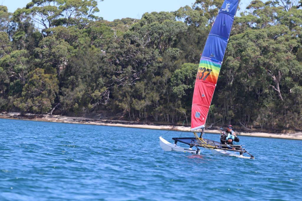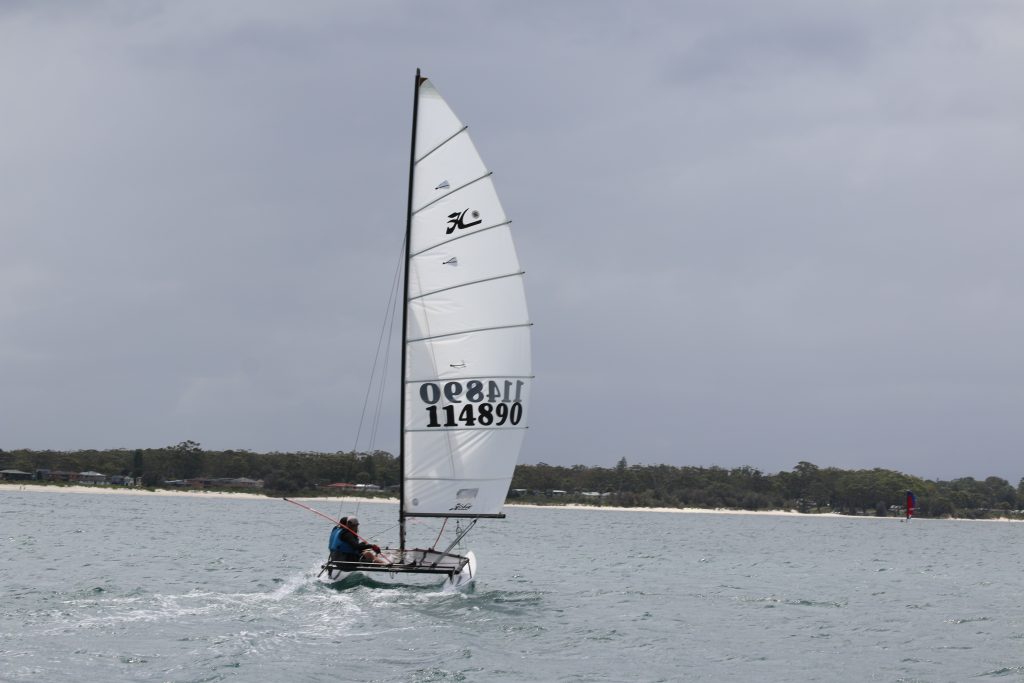 A big sou’westerly was on the cards and blew in from the very early hours. With a slightly different race schedule, the sailors enjoyed their salads and sausages for brunch. The salads from Clare Lord and Ehli Green were delicious, and thank you to Bec & Steve for their help with the BBQ and associated duties! Briefing was at midday, and the planned RTBR was amended in favour of a shorter course between Plantation Point and Moona Moona Creek on account of the swell at Huskisson.