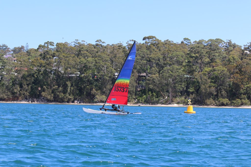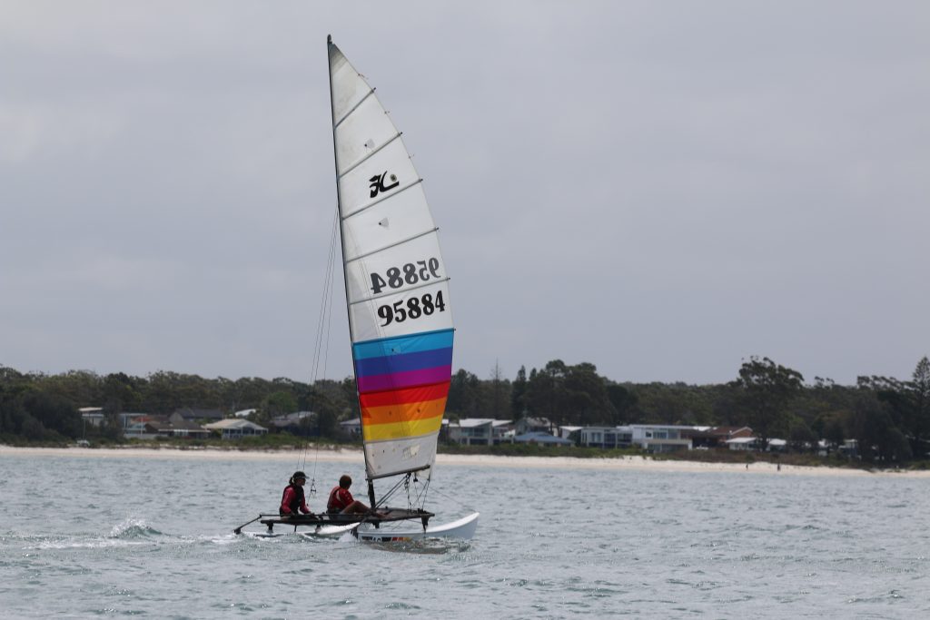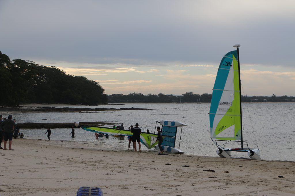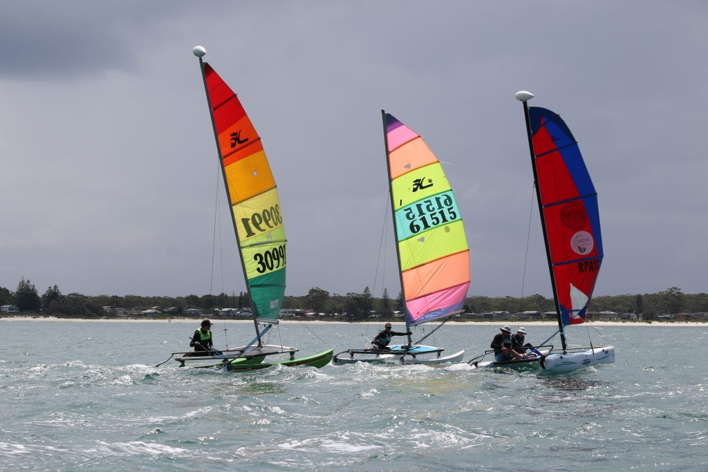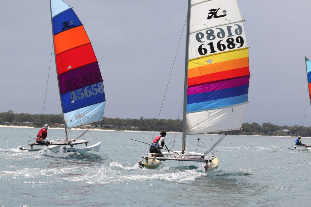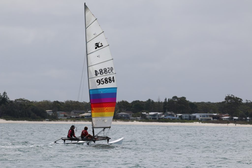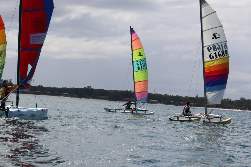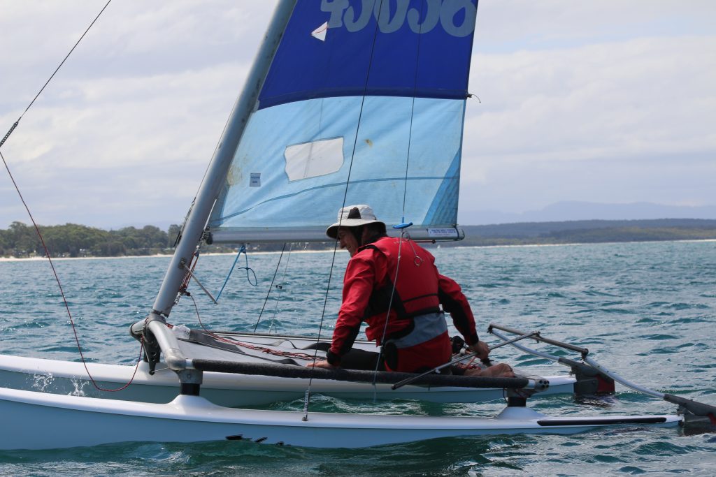 A big sou’westerly was on the cards and blew in from the very early hours. With a slightly different race schedule, the sailors enjoyed their salads and sausages for brunch. The salads from Clare Lord and Ehli Green were delicious, and thank you to Bec & Steve for their help with the BBQ and associated duties! Briefing was at midday, and the planned RTBR was amended in favour of a shorter course between Plantation Point and Moona Moona Creek on account of the swell at Huskisson.