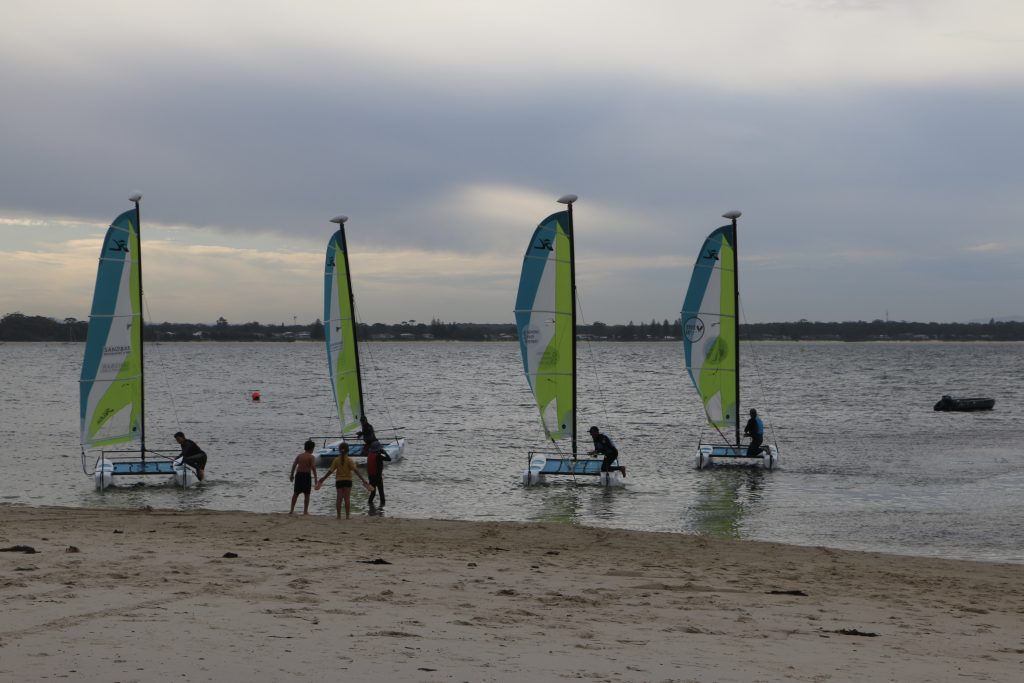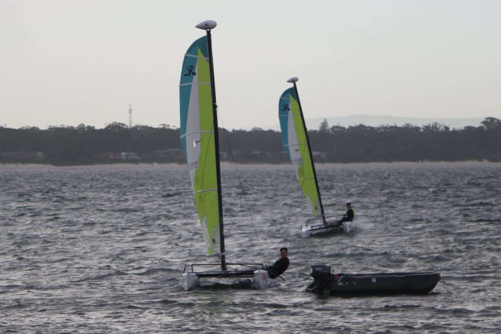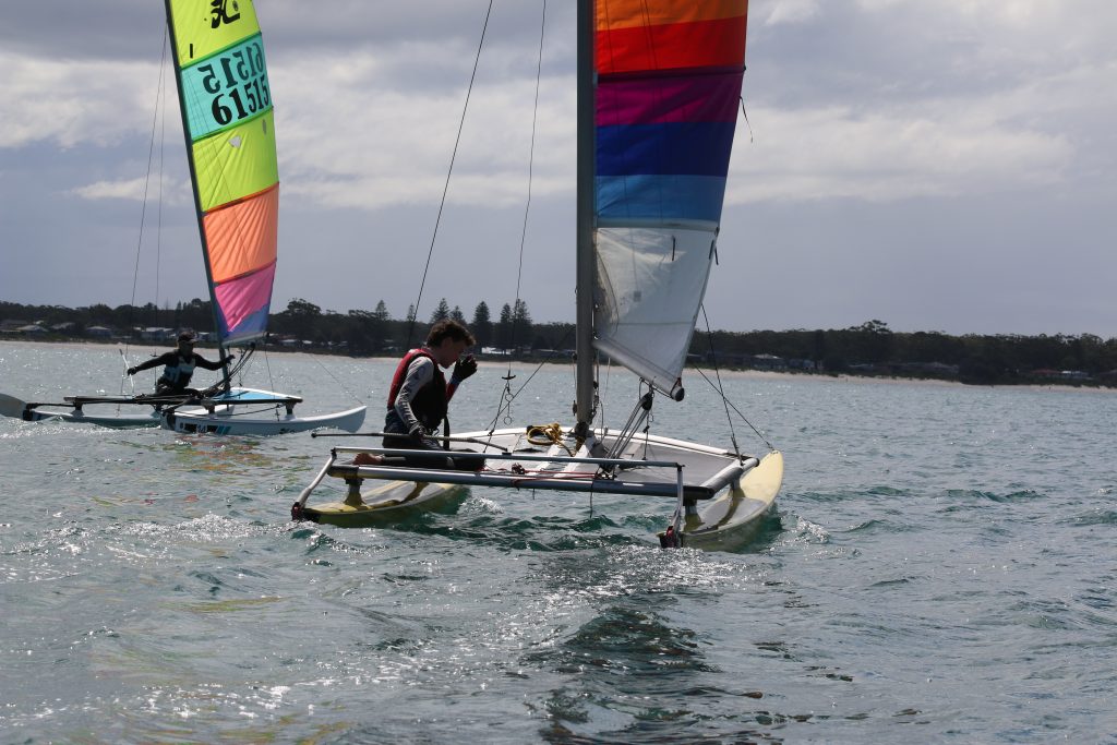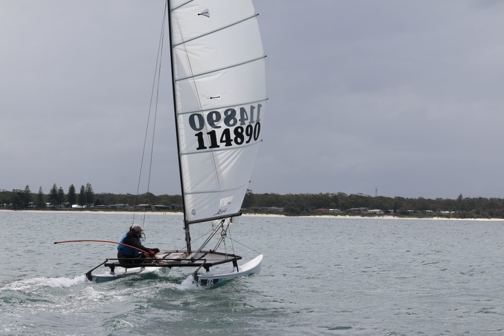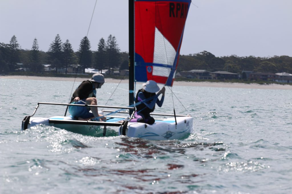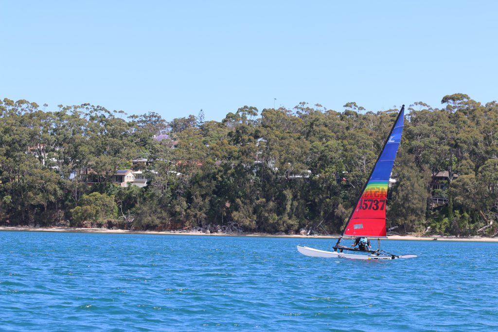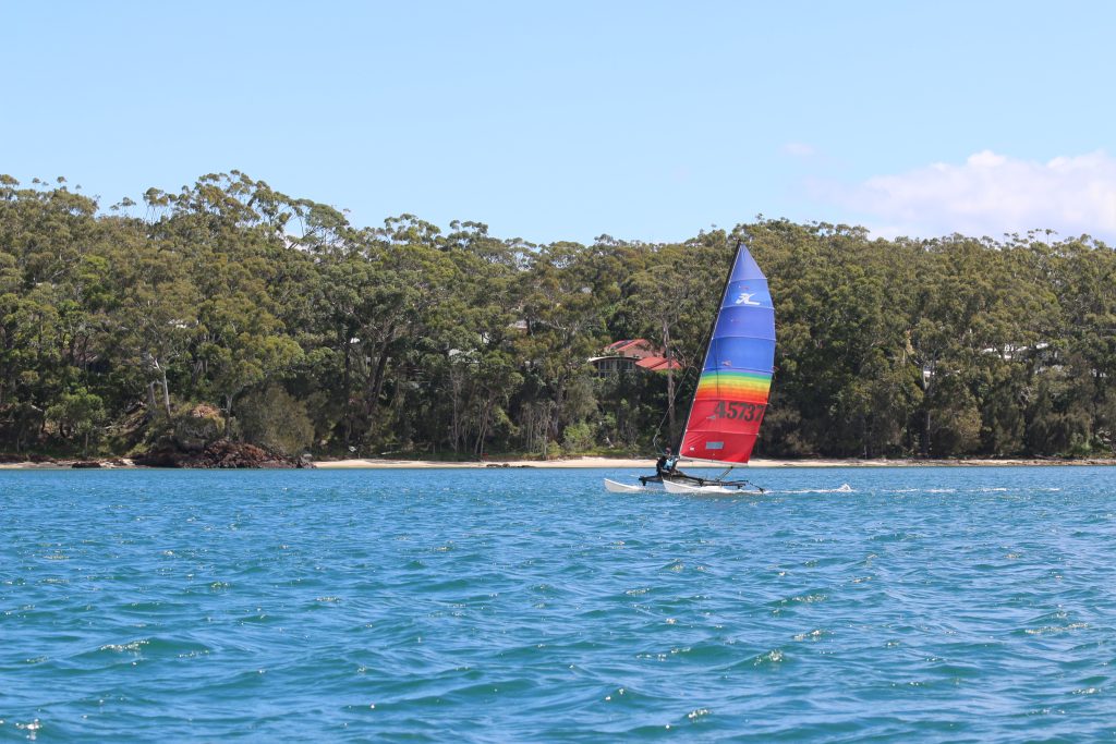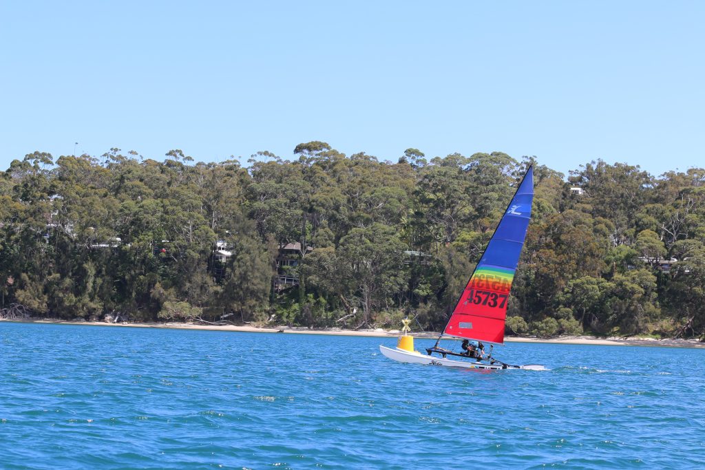 A big sou’westerly was on the cards and blew in from the very early hours. With a slightly different race schedule, the sailors enjoyed their salads and sausages for brunch. The salads from Clare Lord and Ehli Green were delicious, and thank you to Bec & Steve for their help with the BBQ and associated duties! Briefing was at midday, and the planned RTBR was amended in favour of a shorter course between Plantation Point and Moona Moona Creek on account of the swell at Huskisson.