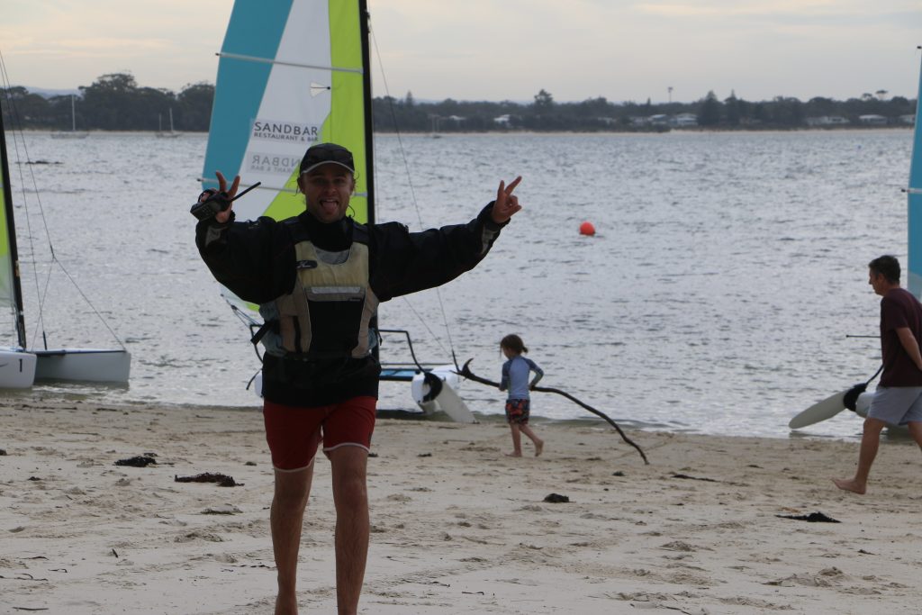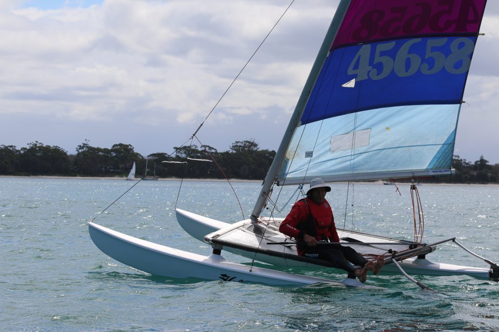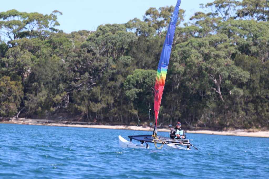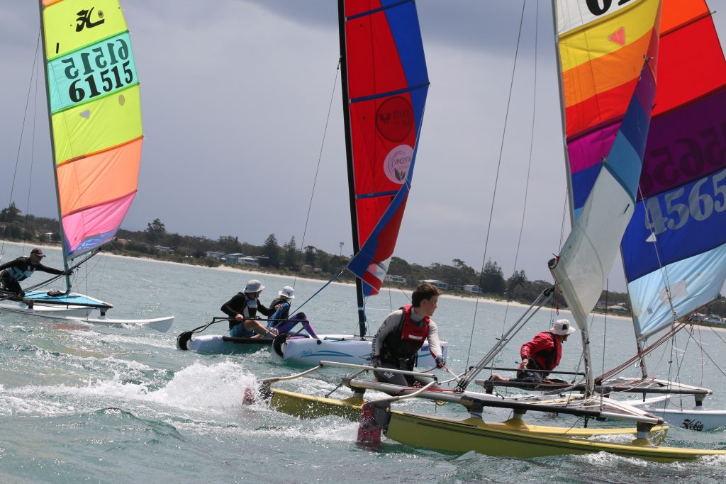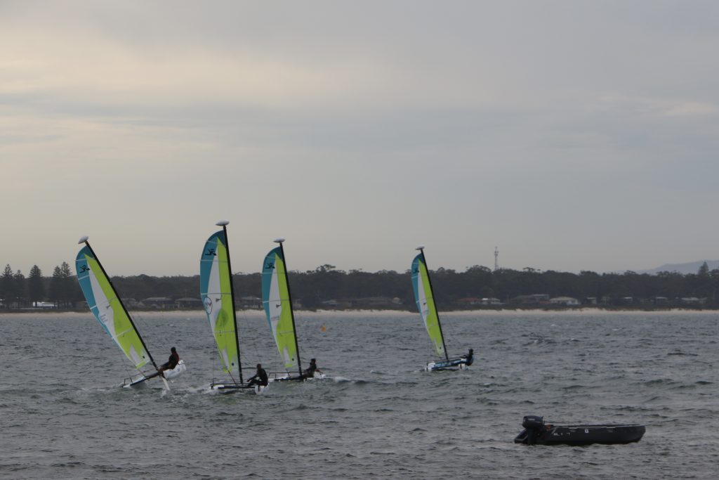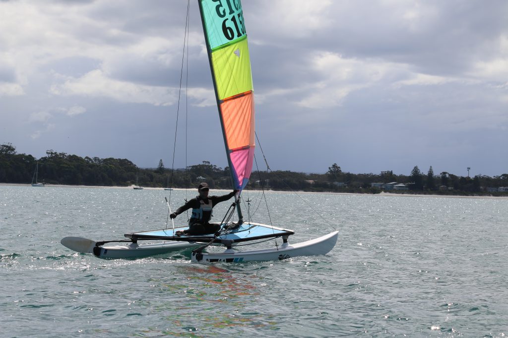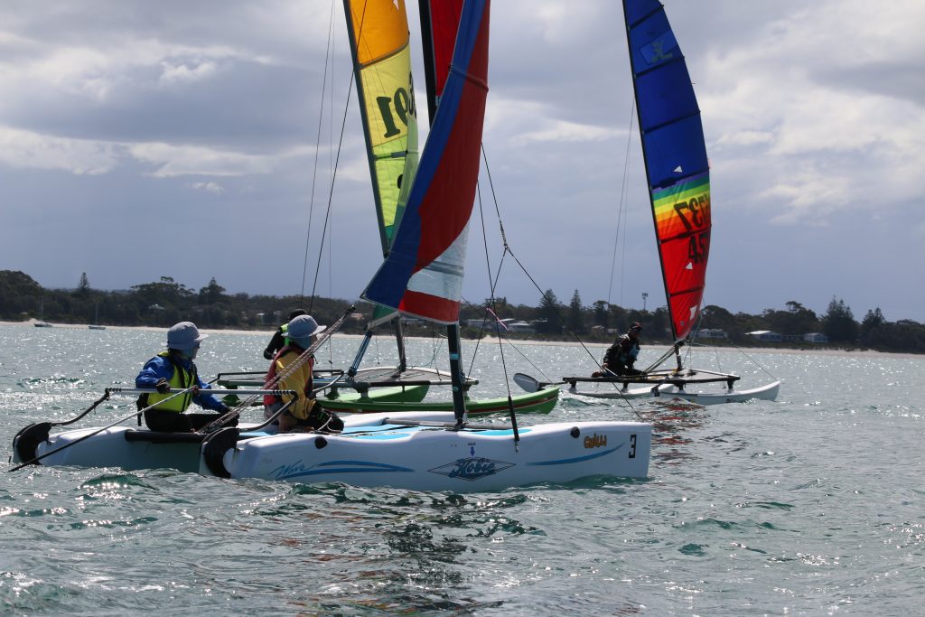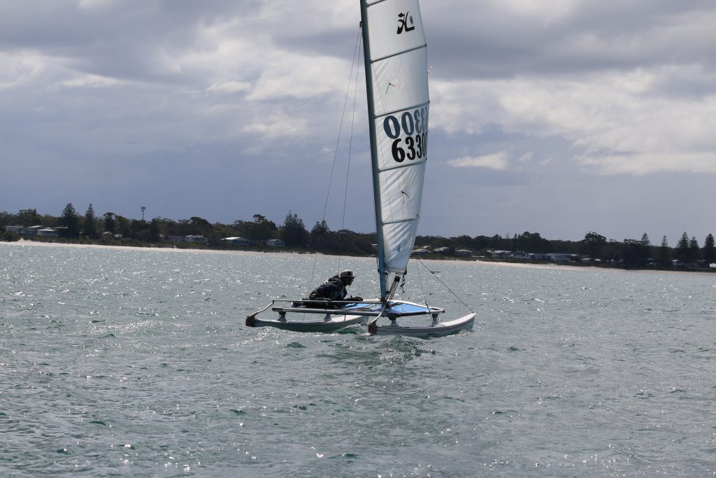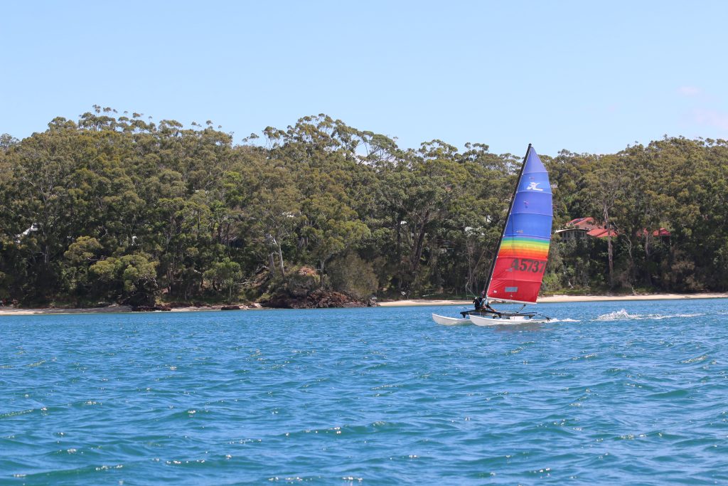 A big sou’westerly was on the cards and blew in from the very early hours. With a slightly different race schedule, the sailors enjoyed their salads and sausages for brunch. The salads from Clare Lord and Ehli Green were delicious, and thank you to Bec & Steve for their help with the BBQ and associated duties! Briefing was at midday, and the planned RTBR was amended in favour of a shorter course between Plantation Point and Moona Moona Creek on account of the swell at Huskisson.