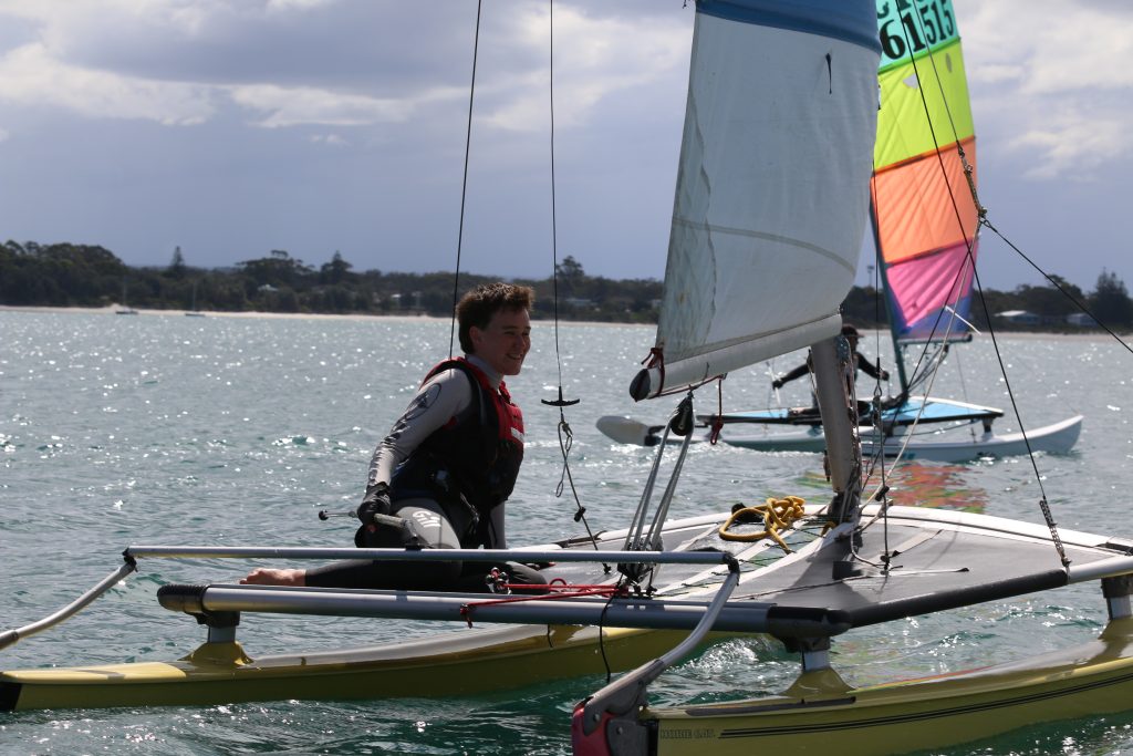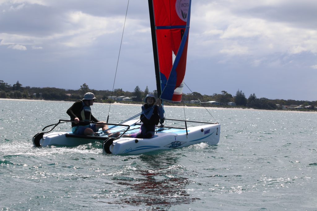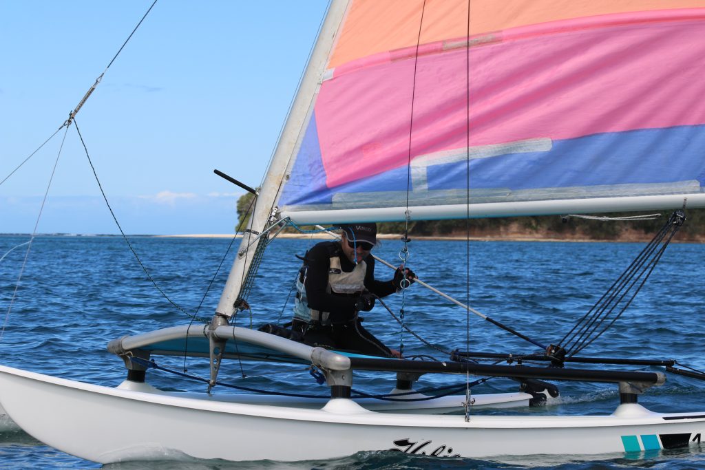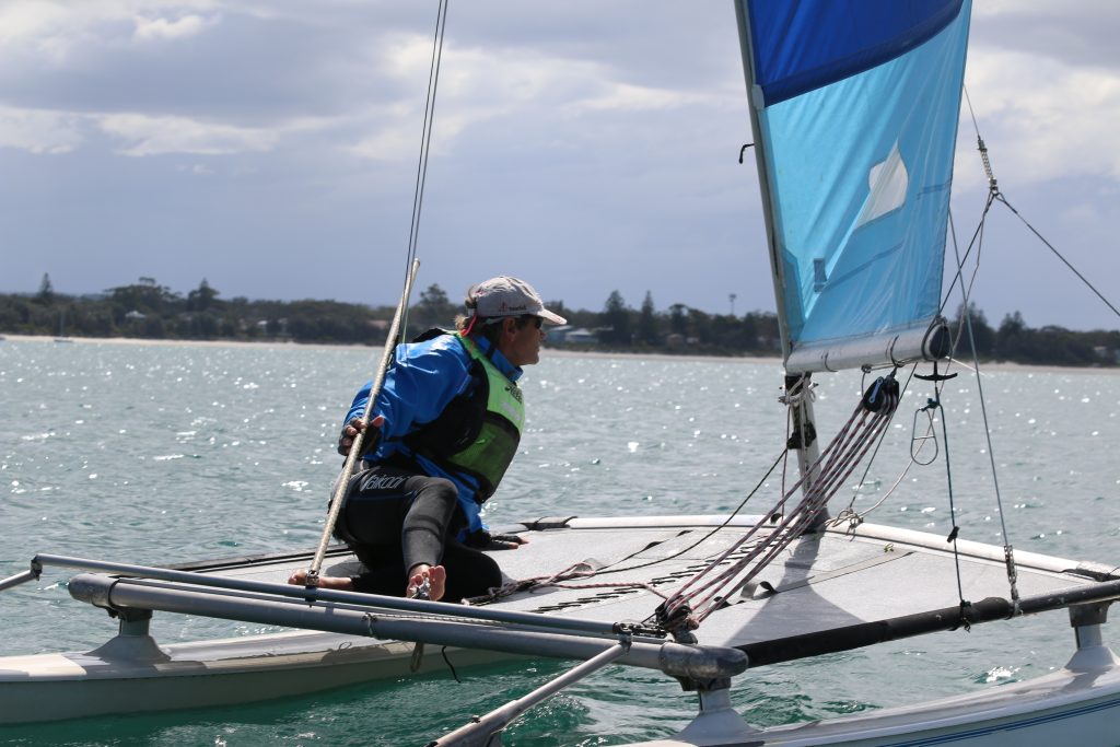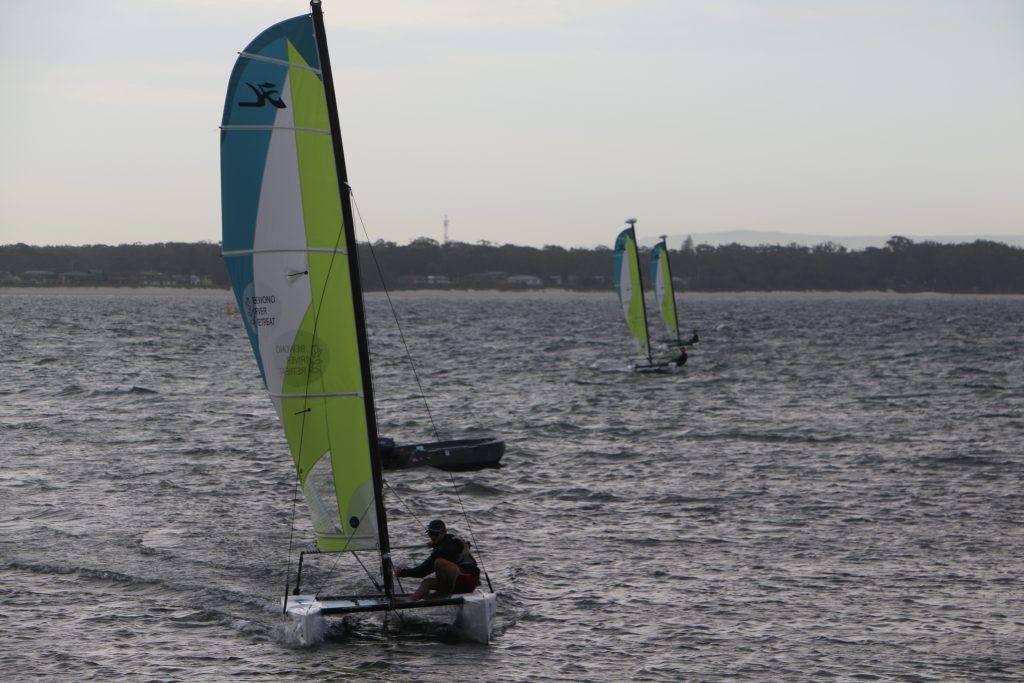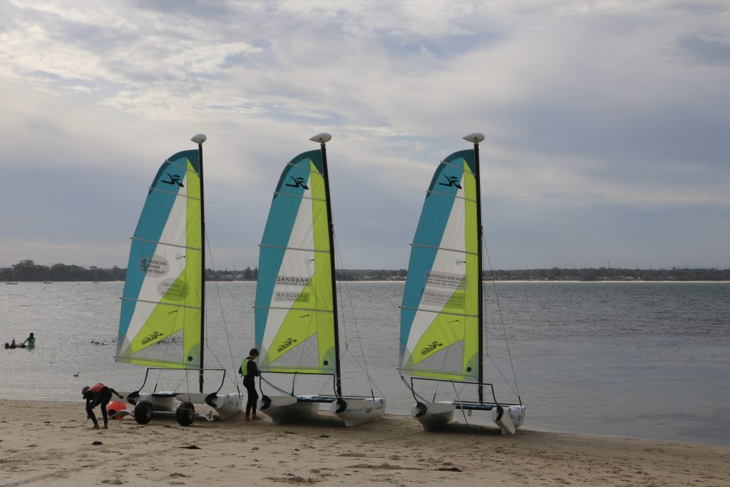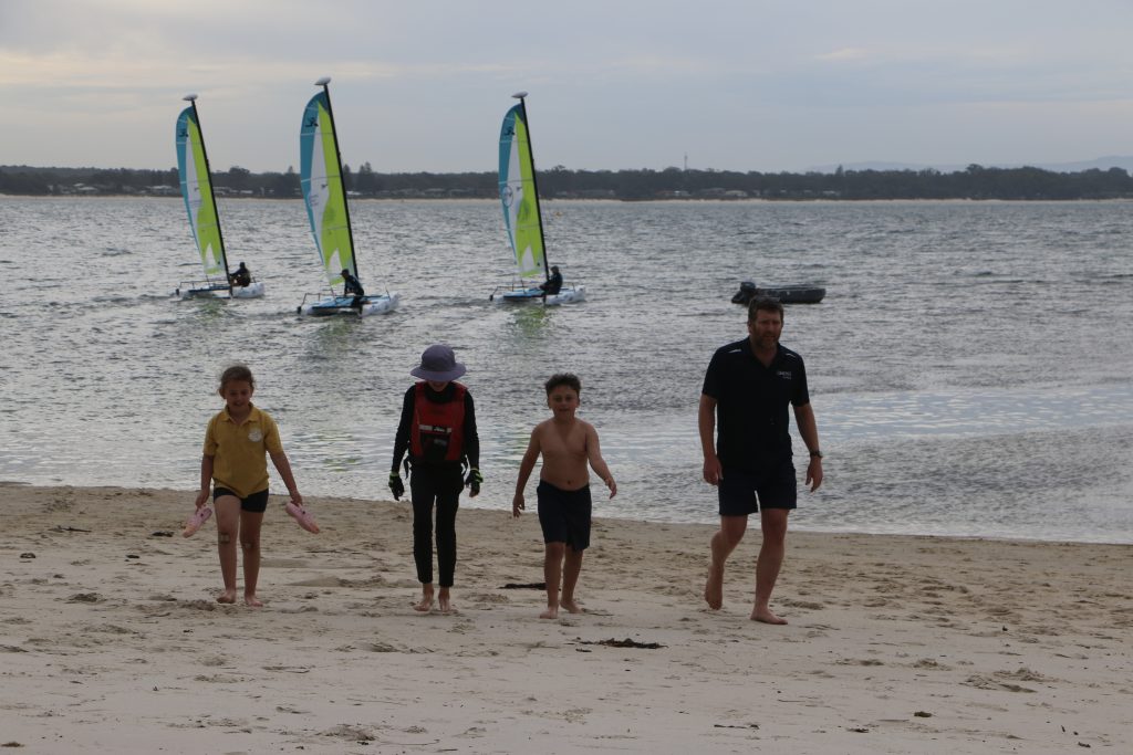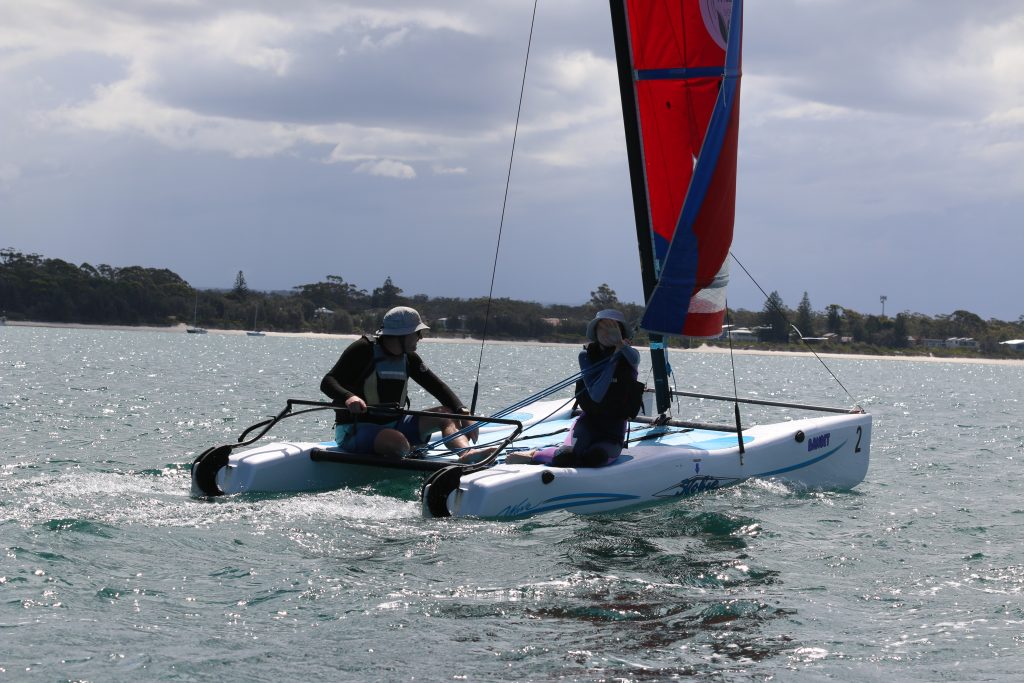 A big sou’westerly was on the cards and blew in from the very early hours. With a slightly different race schedule, the sailors enjoyed their salads and sausages for brunch. The salads from Clare Lord and Ehli Green were delicious, and thank you to Bec & Steve for their help with the BBQ and associated duties! Briefing was at midday, and the planned RTBR was amended in favour of a shorter course between Plantation Point and Moona Moona Creek on account of the swell at Huskisson.