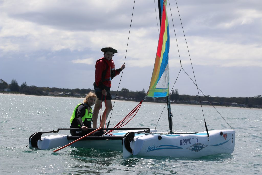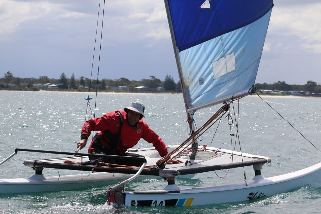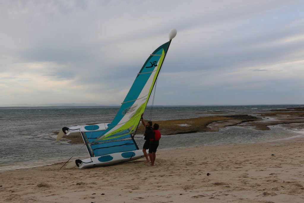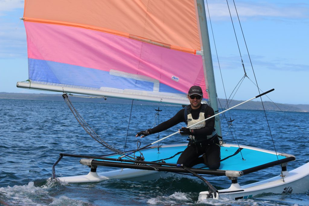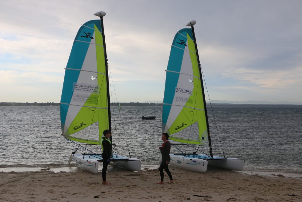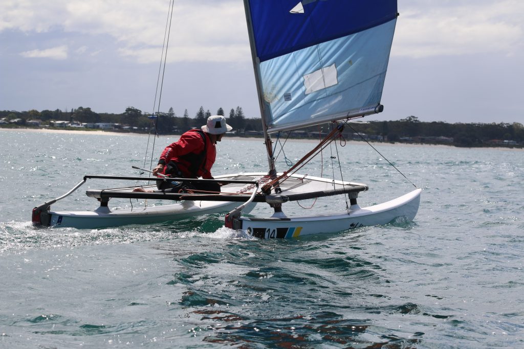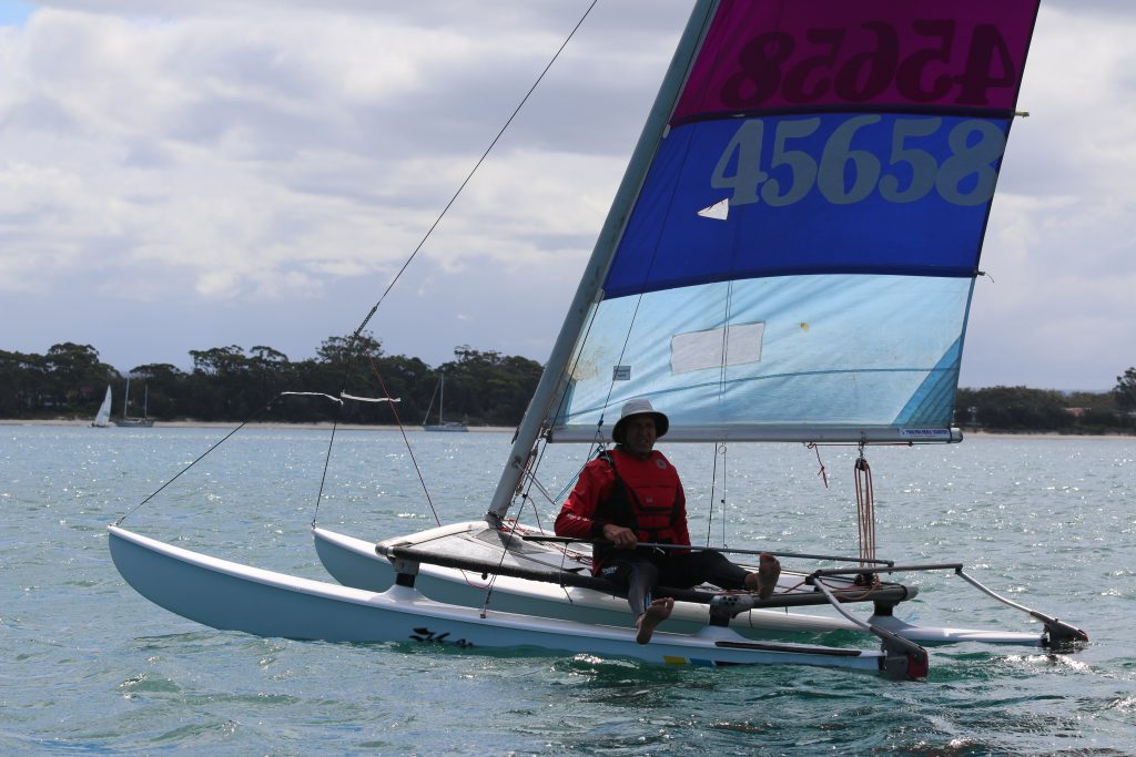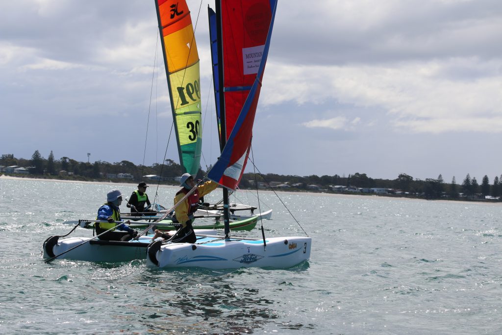 A big sou’westerly was on the cards and blew in from the very early hours. With a slightly different race schedule, the sailors enjoyed their salads and sausages for brunch. The salads from Clare Lord and Ehli Green were delicious, and thank you to Bec & Steve for their help with the BBQ and associated duties! Briefing was at midday, and the planned RTBR was amended in favour of a shorter course between Plantation Point and Moona Moona Creek on account of the swell at Huskisson.