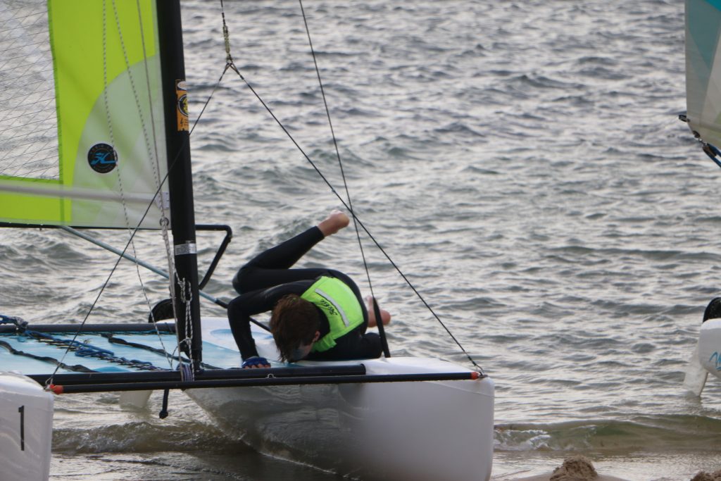 In the 16s, Matt & Ollie were consistent on the first downwind leg, but they didn’t have much competition as Bridget & Euan, after a capsize on the way to the start, were struggling to depower without completely losing boat speed. Matt & Ollie made it around the course, and Bridget & Euan just went for a fun jaunt before returning to shore.