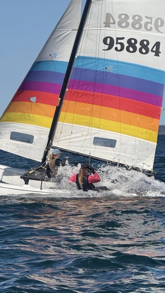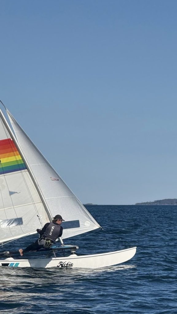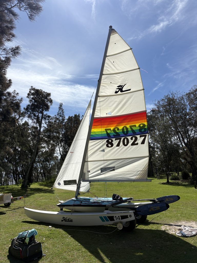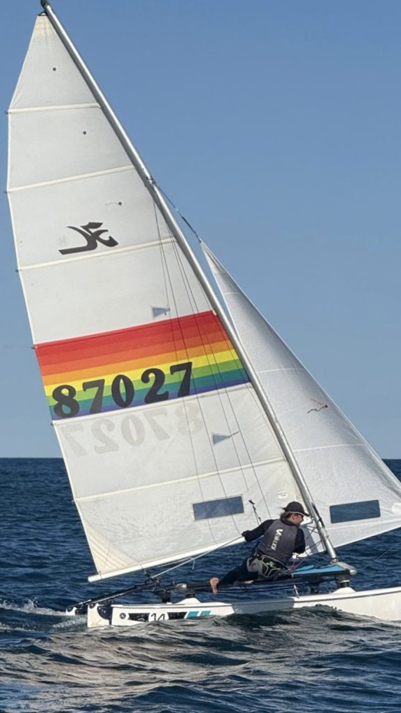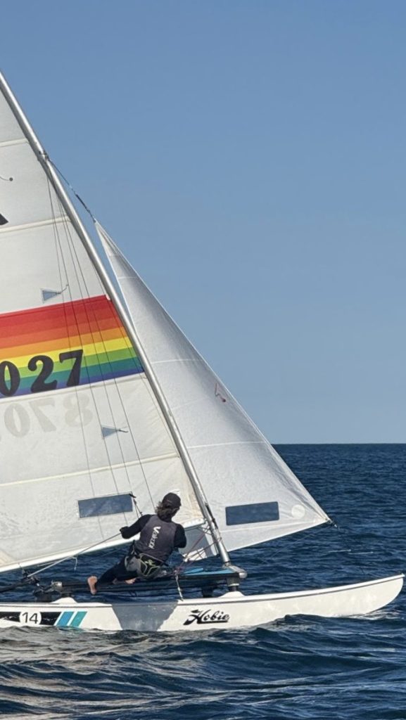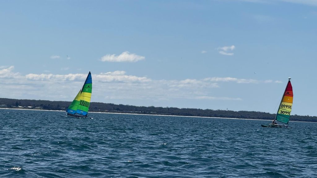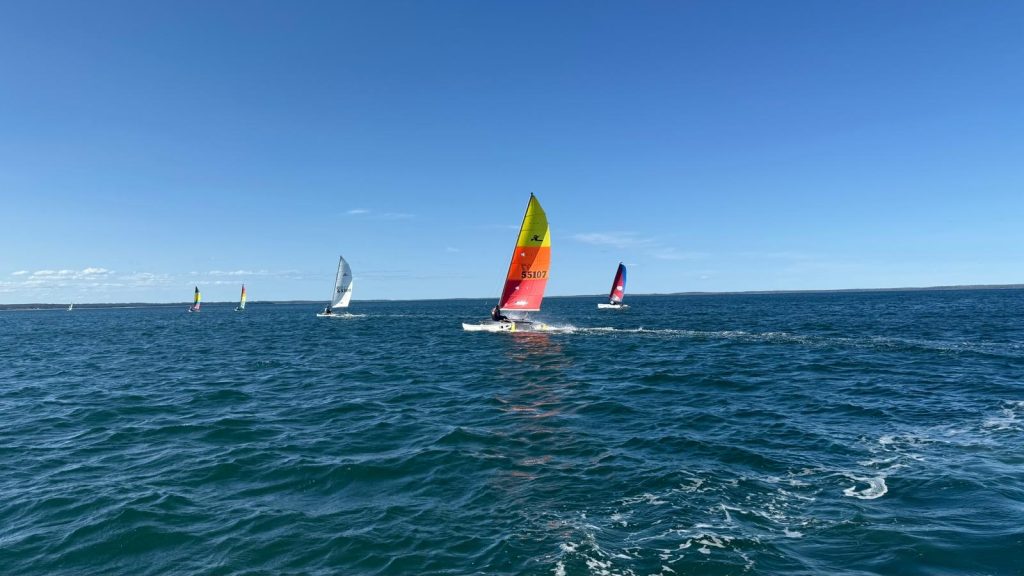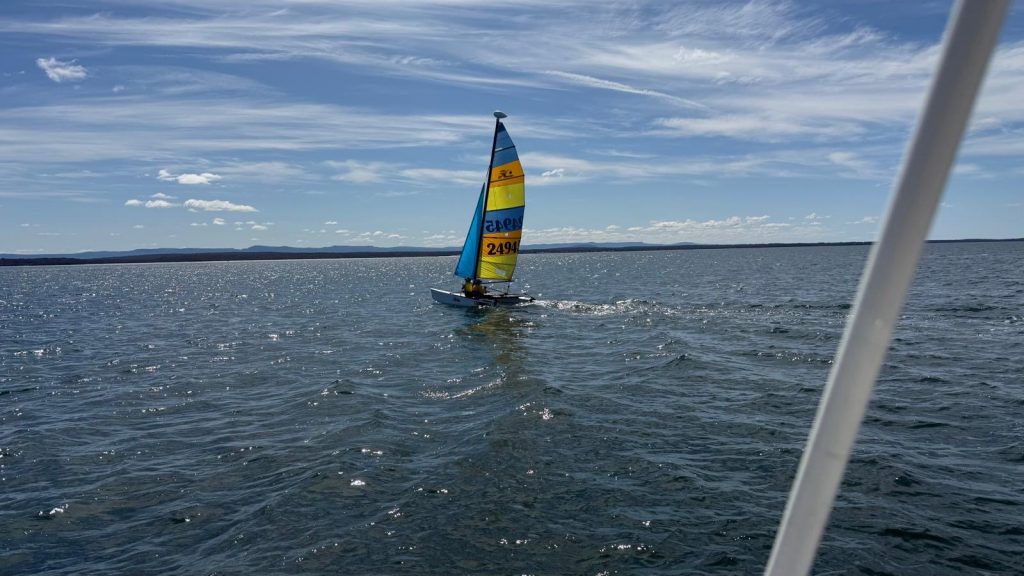 With three Hobie 16s and one F18 starting three minutes after the small boats, the chase was on to catch the fleet. Andrew and Pat managed to hold off the big boats to take first and second, while Joel and River completed their first long-distance race on the Dragoon, finishing ahead of the “old boys” on the Hobie 14s.