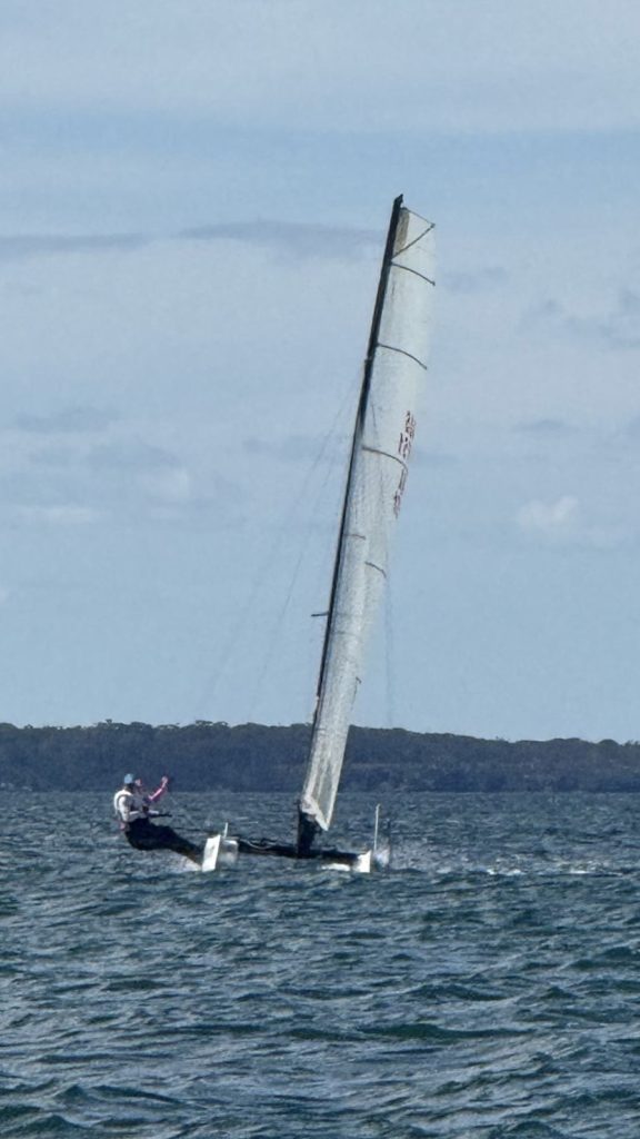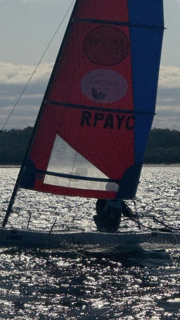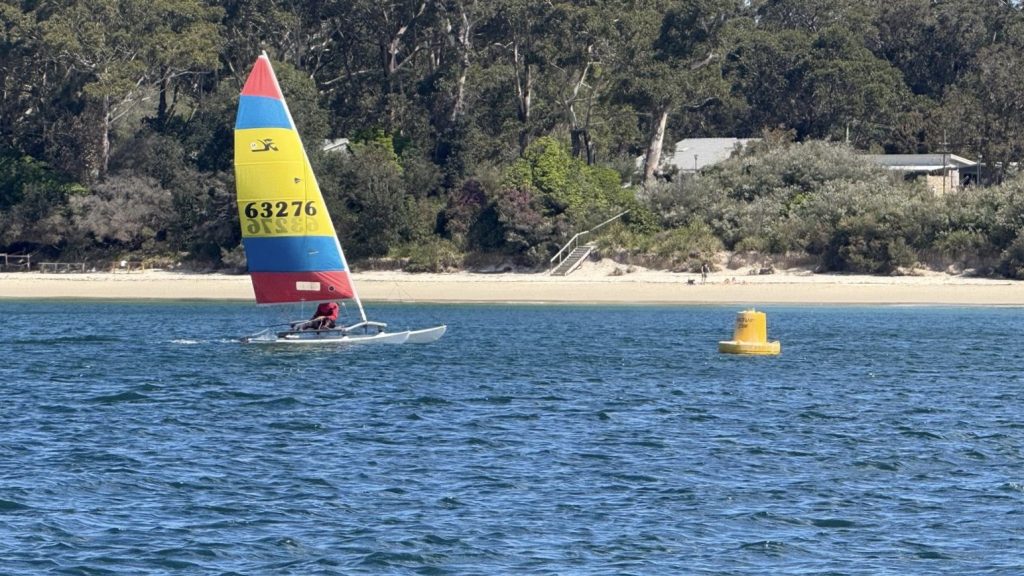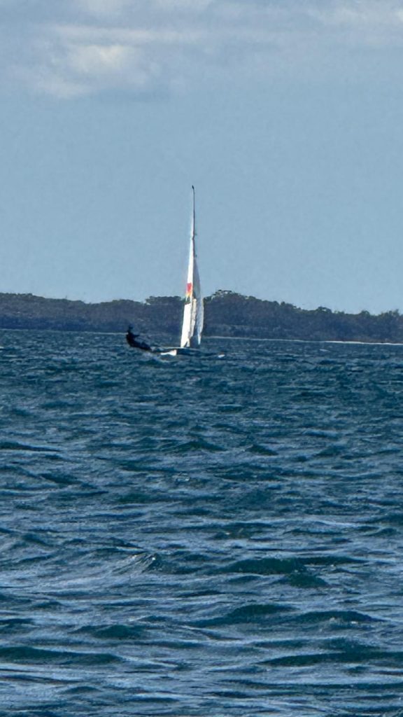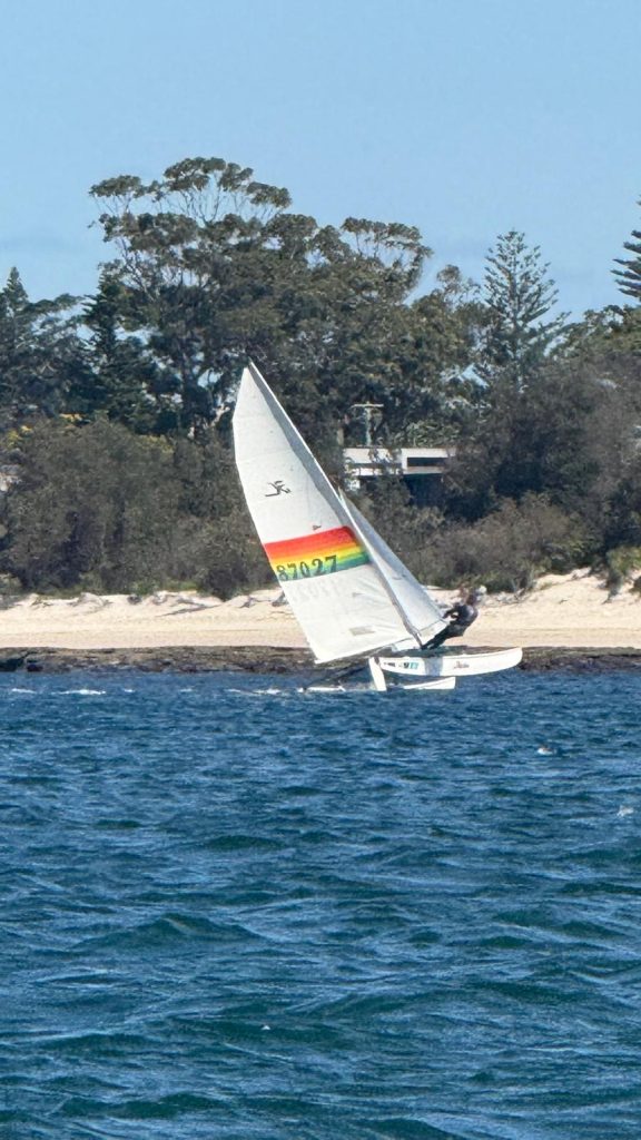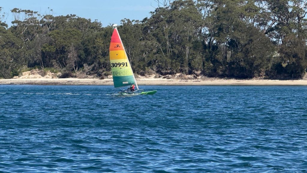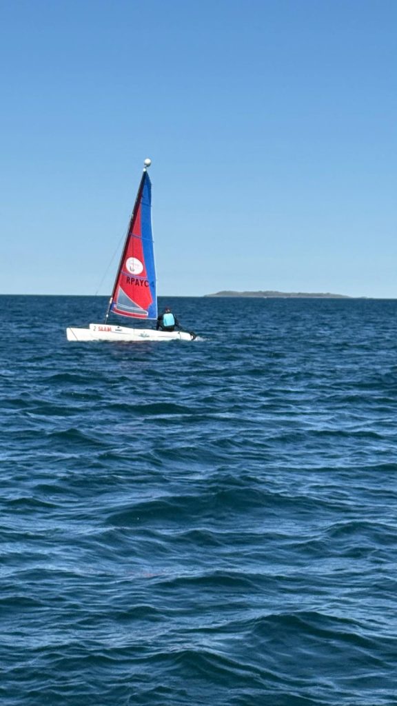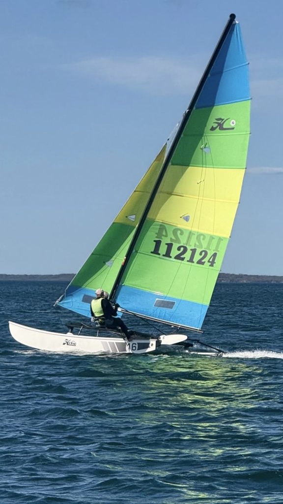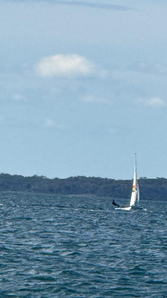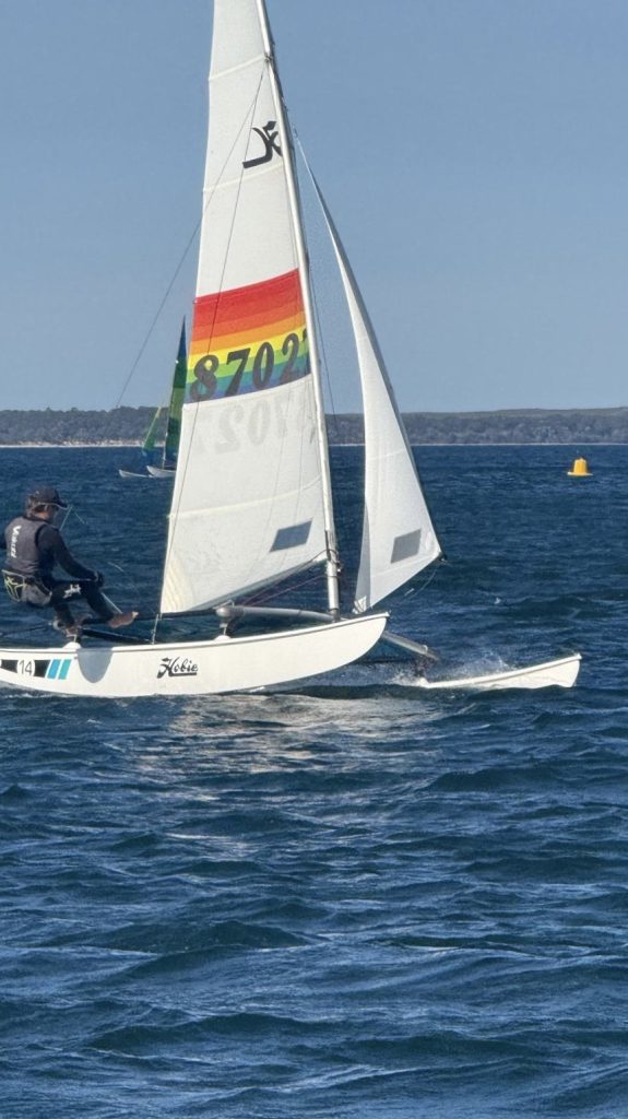 With a Round the Bay scheduled for today, the forecast was looking shifty at best. Arriving at the Club to a nice 12-knot west-nor’wester, the day was looking promising for some fun racing. With the first mark set off Huskisson Beach, a downwind start was on the cards. Changing wind speeds meant that being in the right spot paid dividends, as Pat Butler found out by reaching the first mark well ahead of the other small boats on his Hobie 14 Turbo.