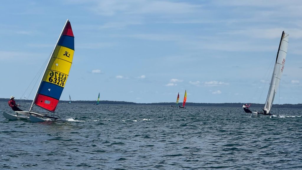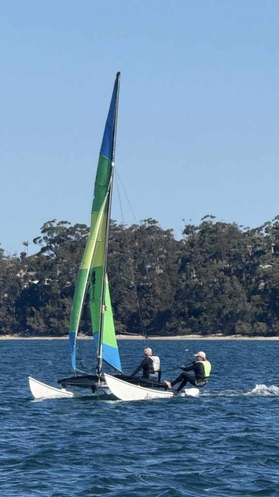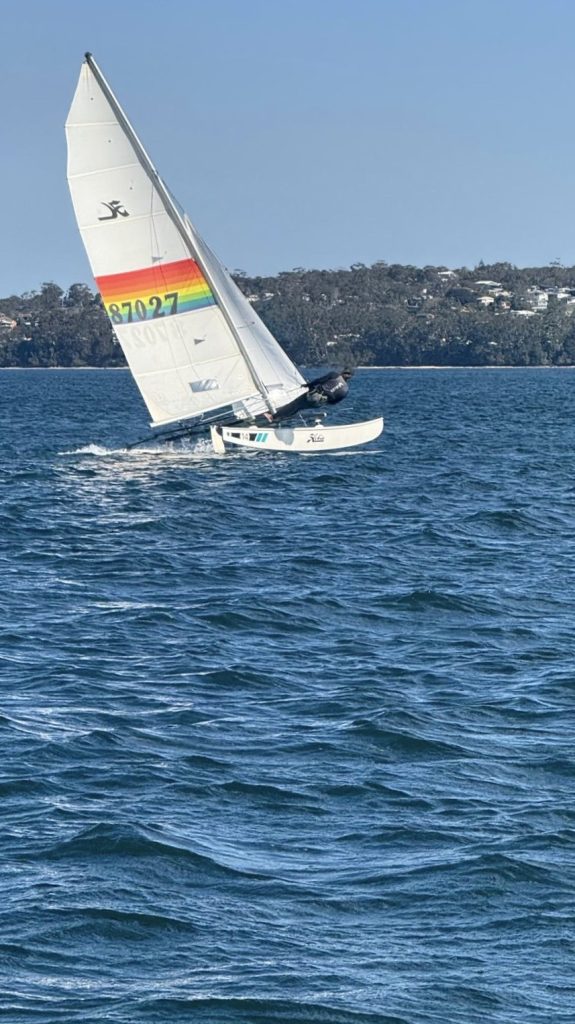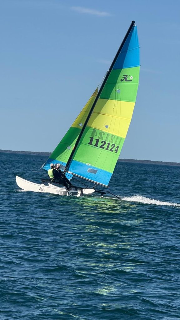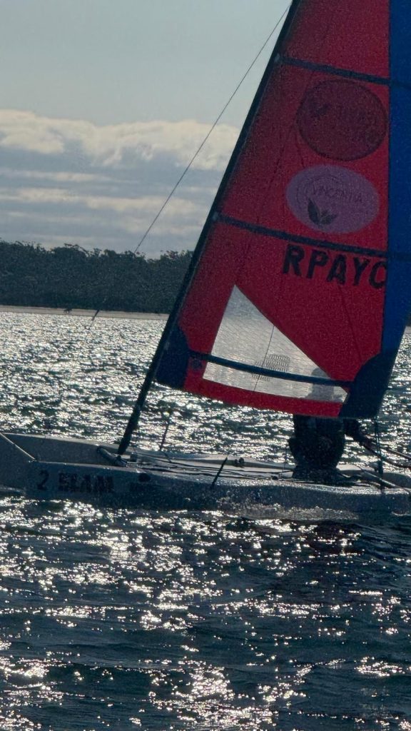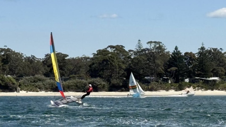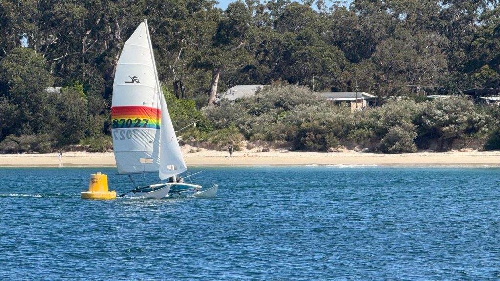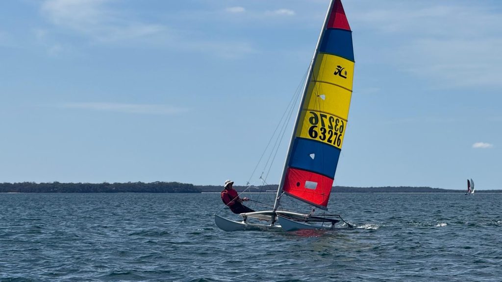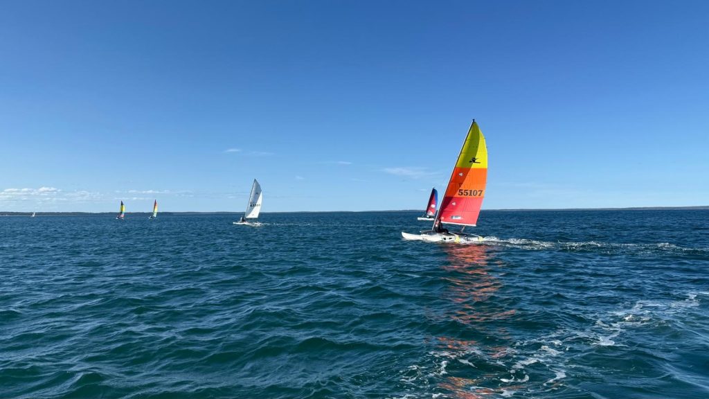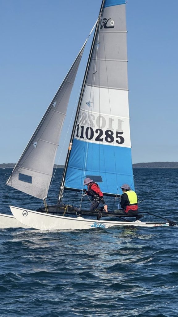 With a Round the Bay scheduled for today, the forecast was looking shifty at best. Arriving at the Club to a nice 12-knot west-nor’wester, the day was looking promising for some fun racing. With the first mark set off Huskisson Beach, a downwind start was on the cards. Changing wind speeds meant that being in the right spot paid dividends, as Pat Butler found out by reaching the first mark well ahead of the other small boats on his Hobie 14 Turbo.