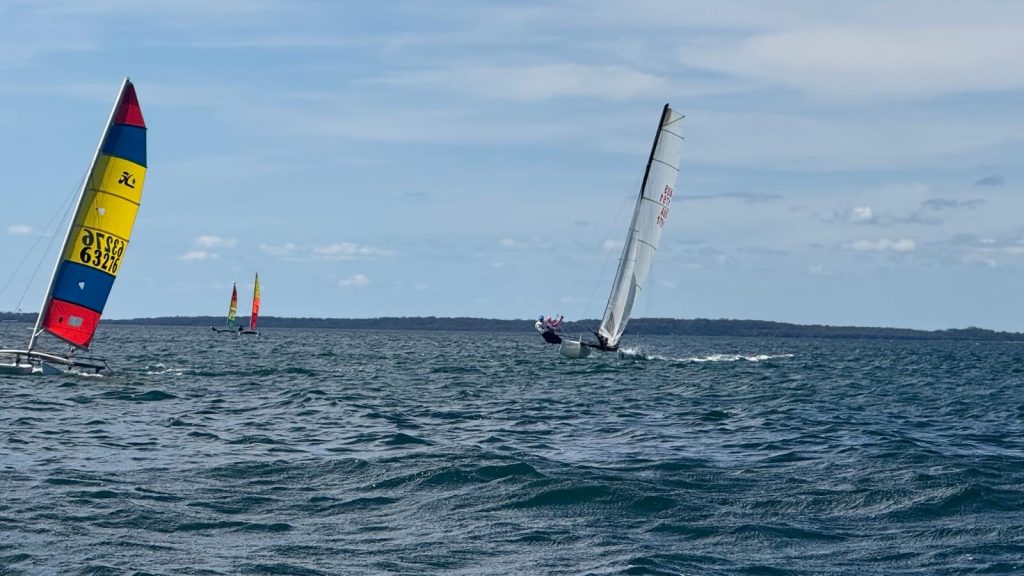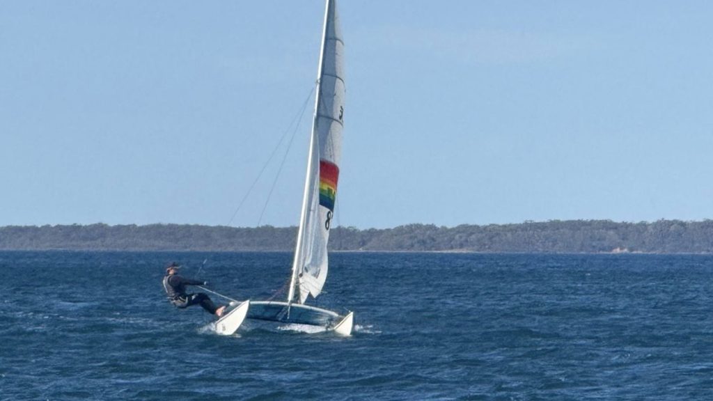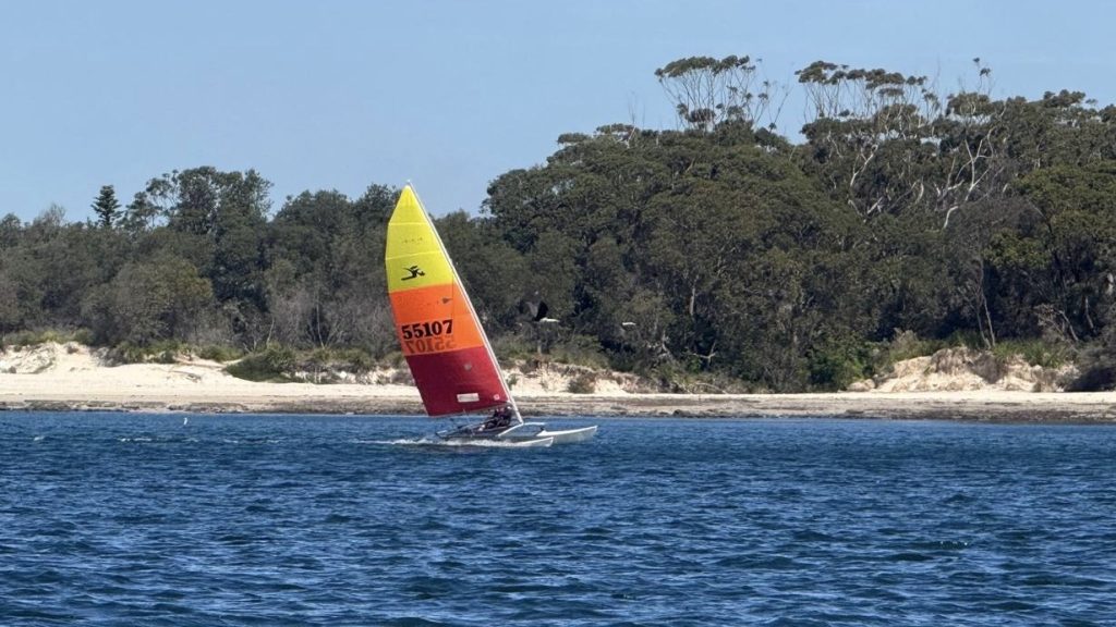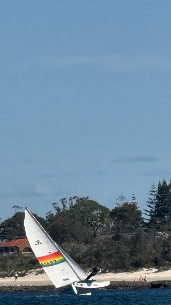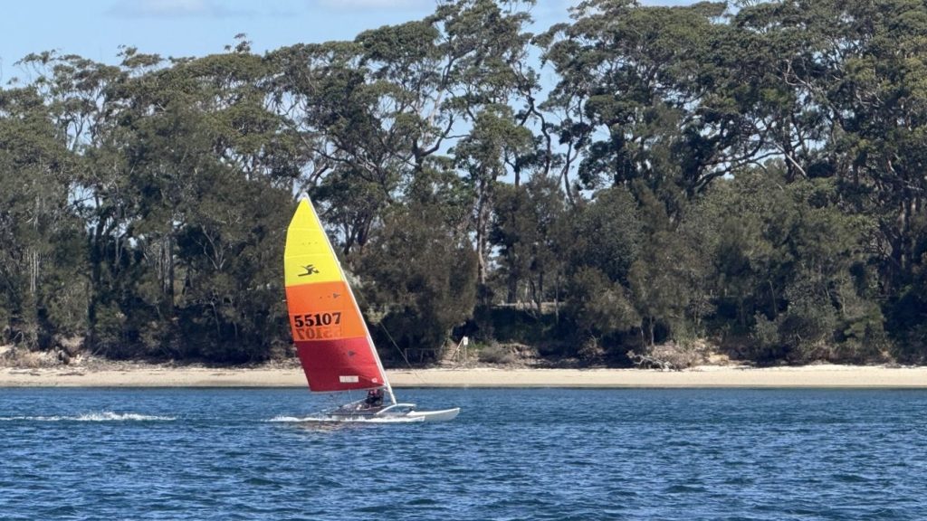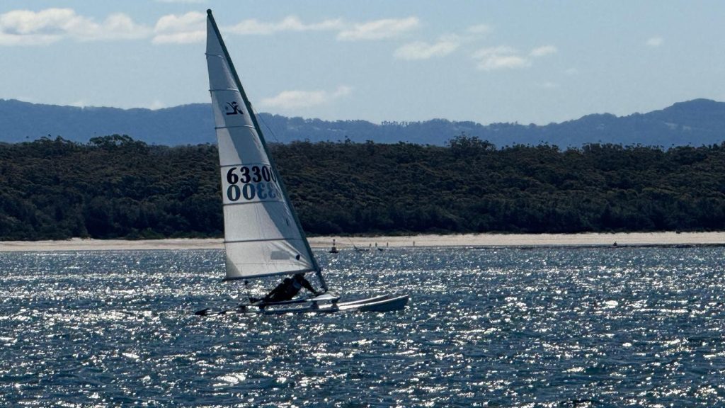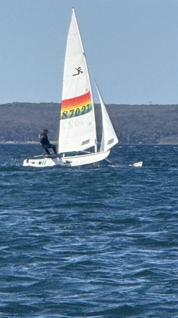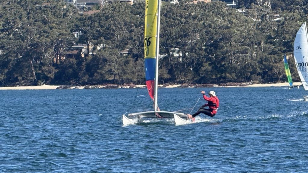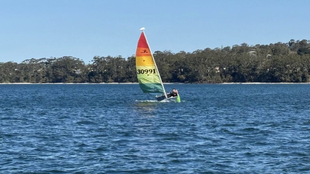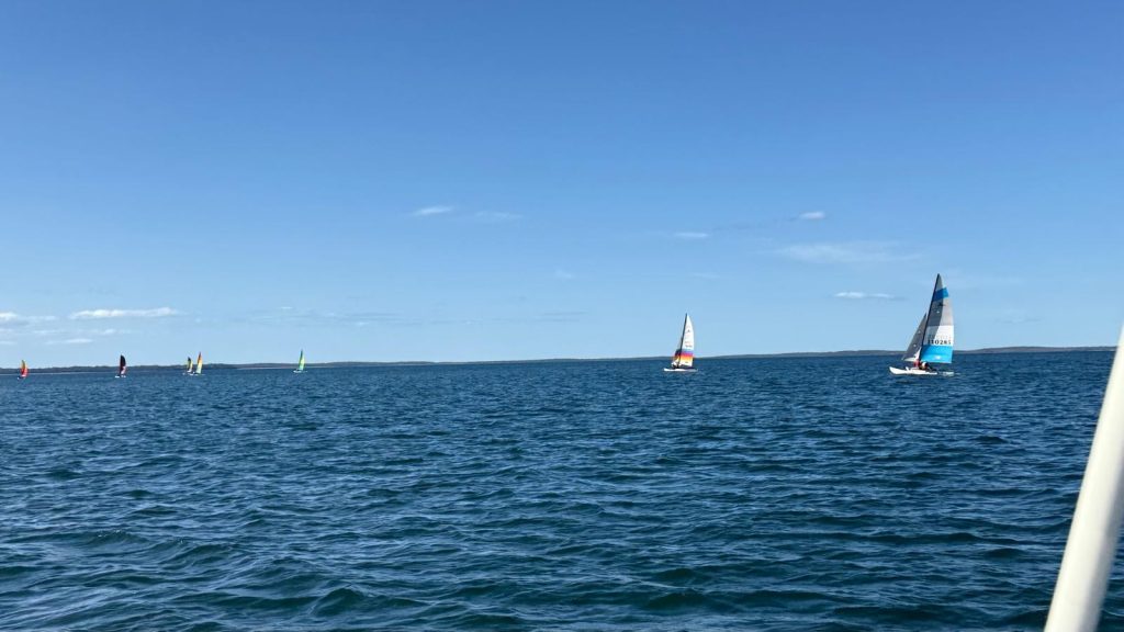 With a Round the Bay scheduled for today, the forecast was looking shifty at best. Arriving at the Club to a nice 12-knot west-nor’wester, the day was looking promising for some fun racing. With the first mark set off Huskisson Beach, a downwind start was on the cards. Changing wind speeds meant that being in the right spot paid dividends, as Pat Butler found out by reaching the first mark well ahead of the other small boats on his Hobie 14 Turbo.