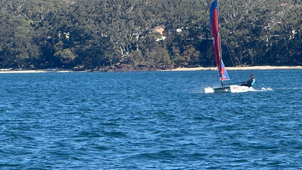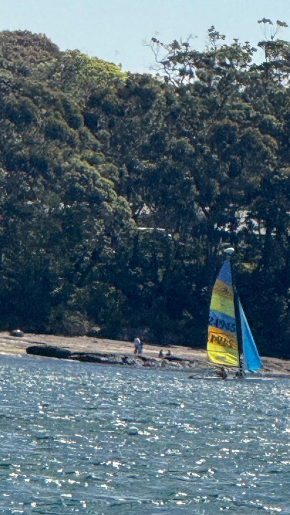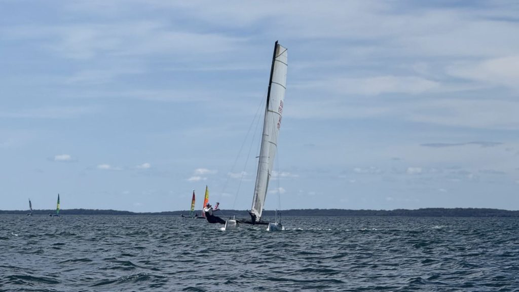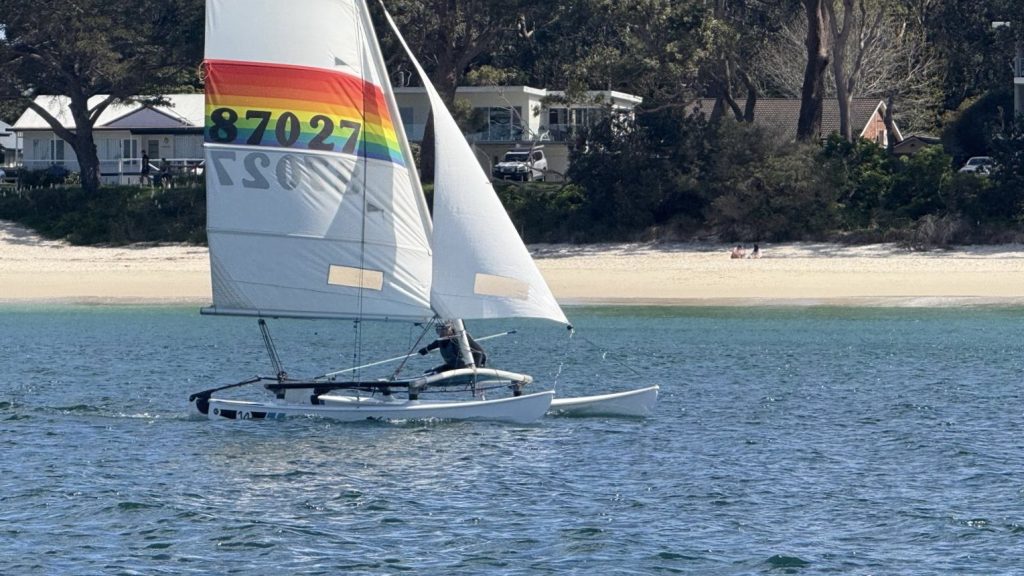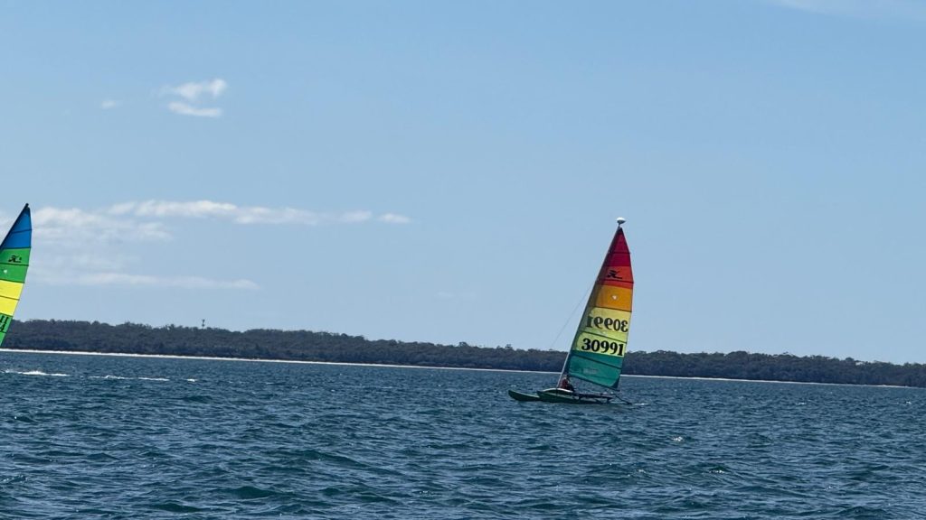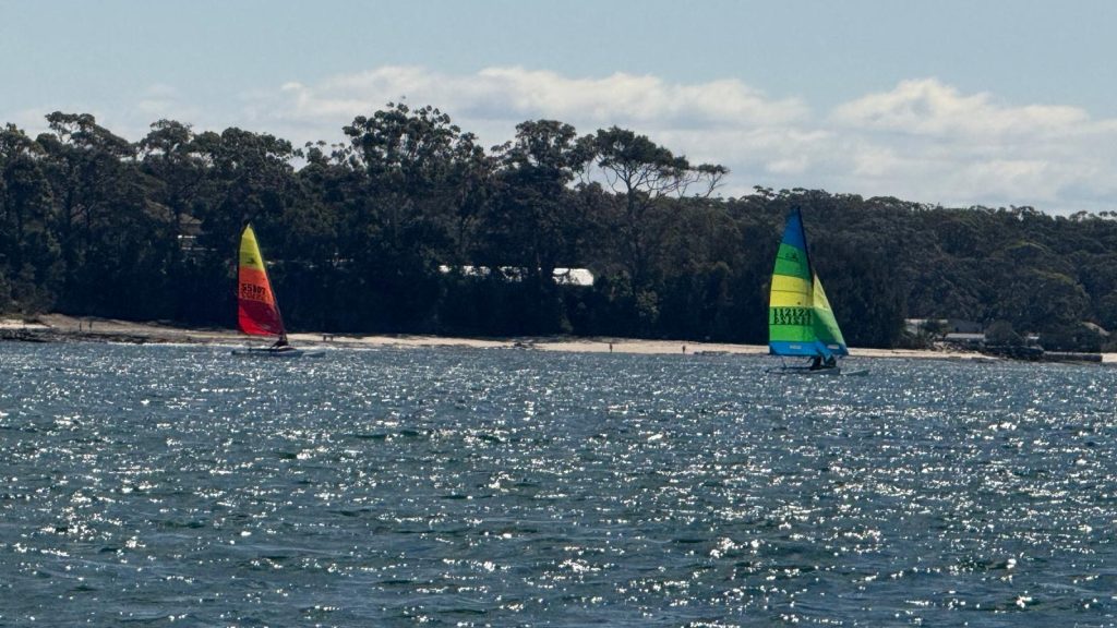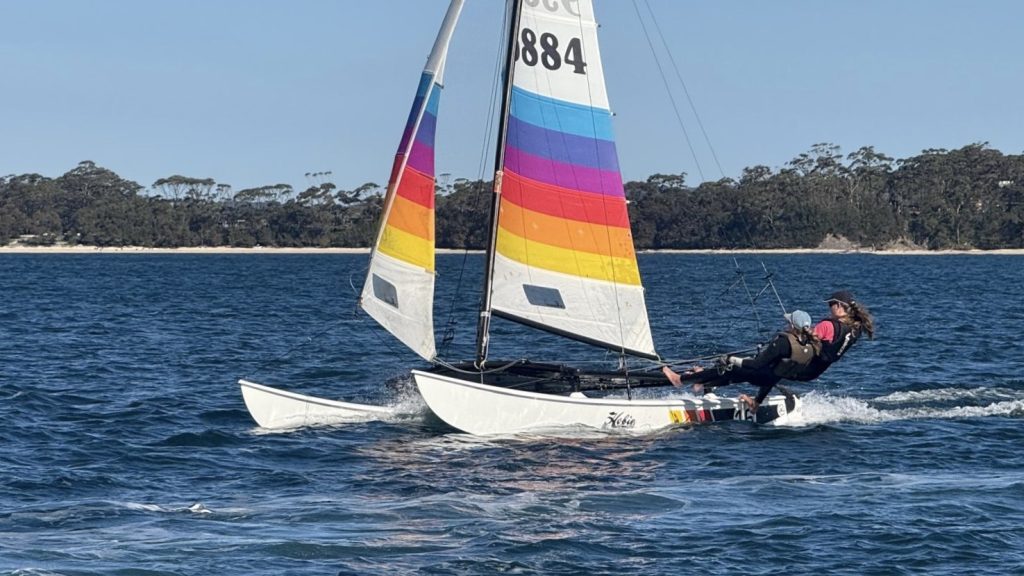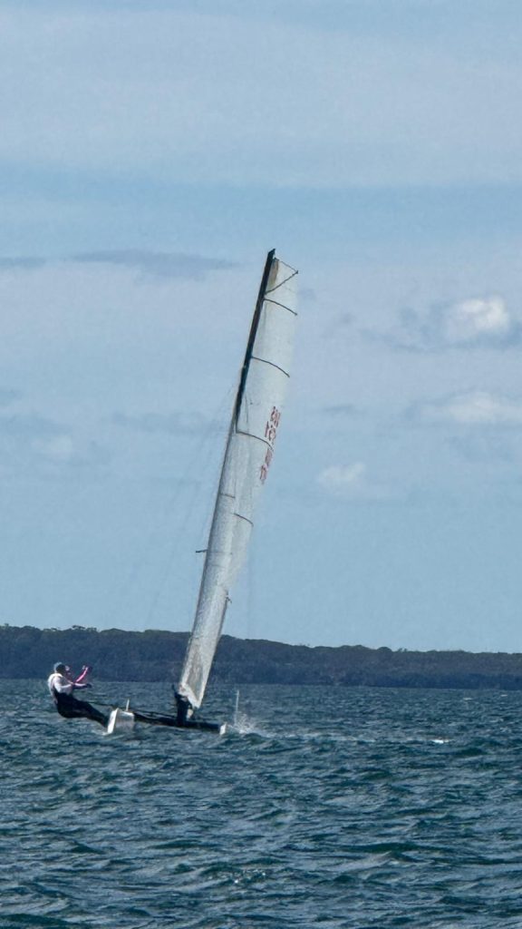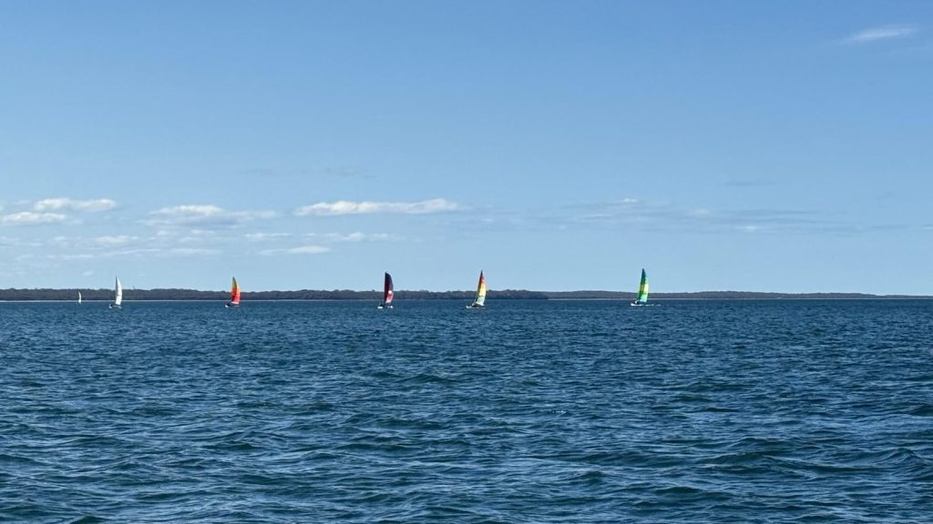 With a Round the Bay scheduled for today, the forecast was looking shifty at best. Arriving at the Club to a nice 12-knot west-nor’wester, the day was looking promising for some fun racing. With the first mark set off Huskisson Beach, a downwind start was on the cards. Changing wind speeds meant that being in the right spot paid dividends, as Pat Butler found out by reaching the first mark well ahead of the other small boats on his Hobie 14 Turbo.