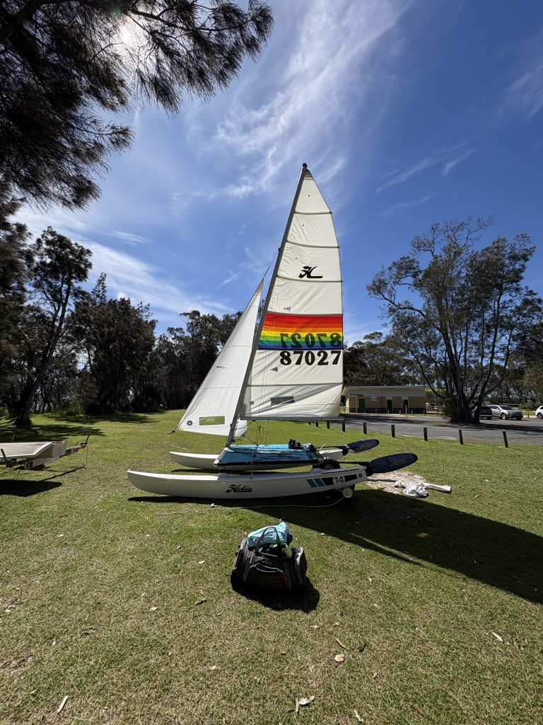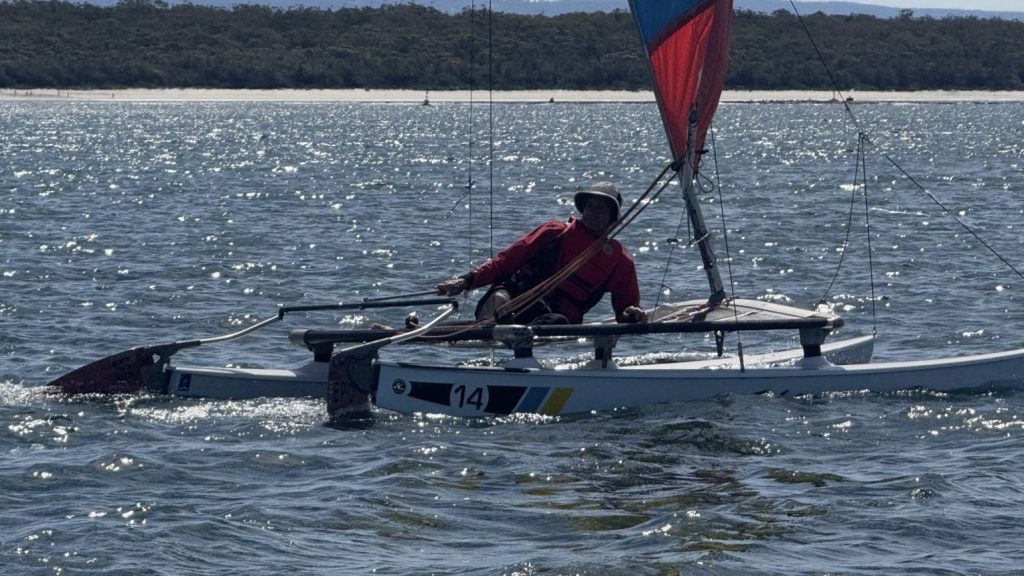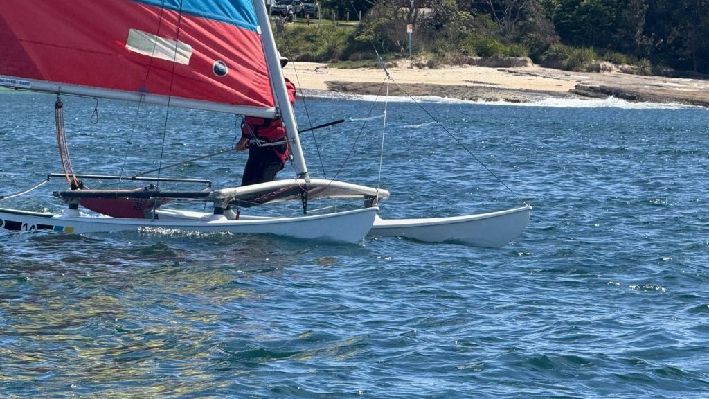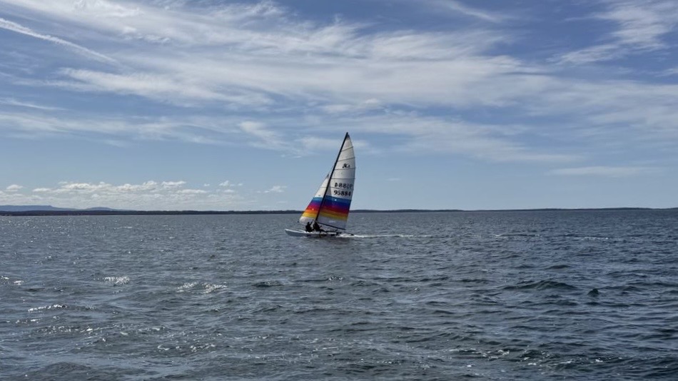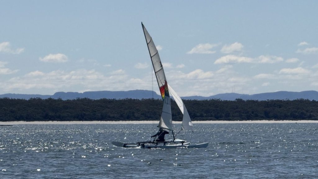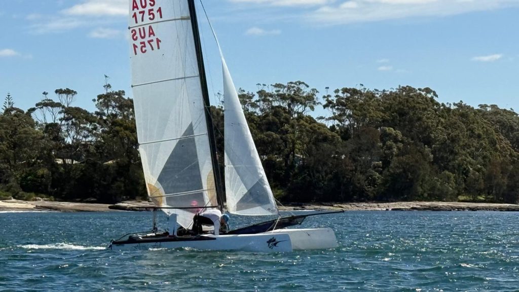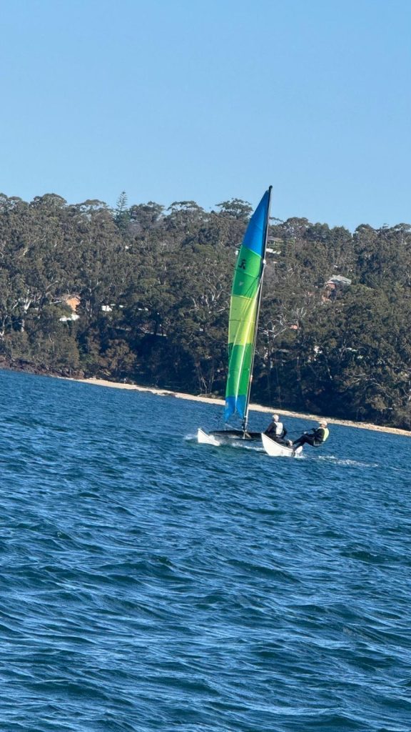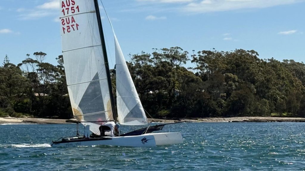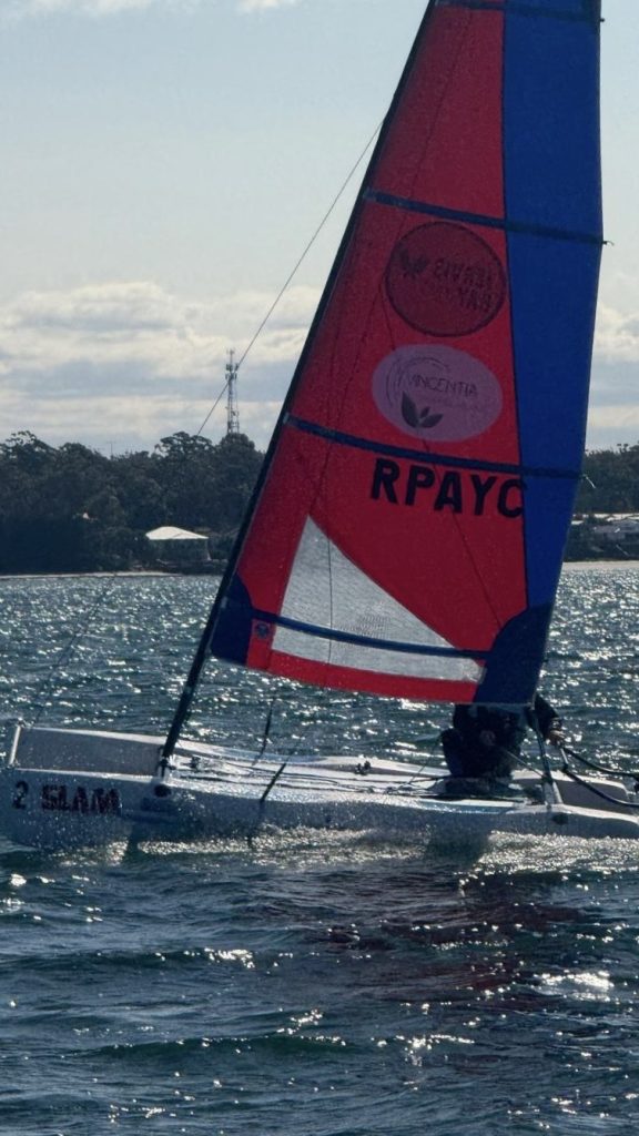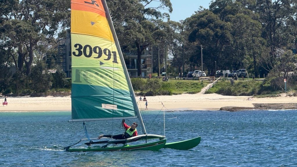 With a Round the Bay scheduled for today, the forecast was looking shifty at best. Arriving at the Club to a nice 12-knot west-nor’wester, the day was looking promising for some fun racing. With the first mark set off Huskisson Beach, a downwind start was on the cards. Changing wind speeds meant that being in the right spot paid dividends, as Pat Butler found out by reaching the first mark well ahead of the other small boats on his Hobie 14 Turbo.