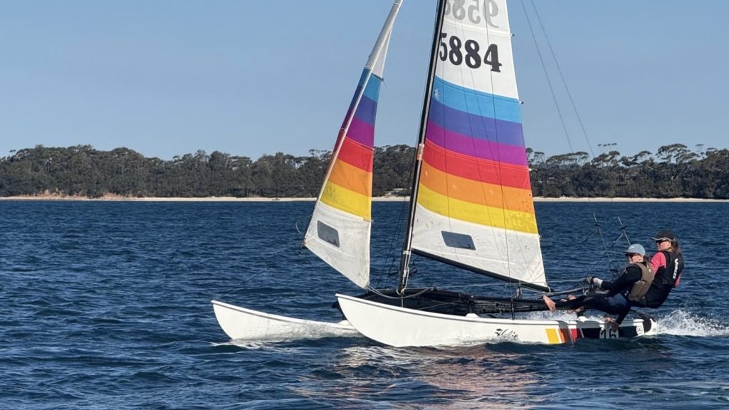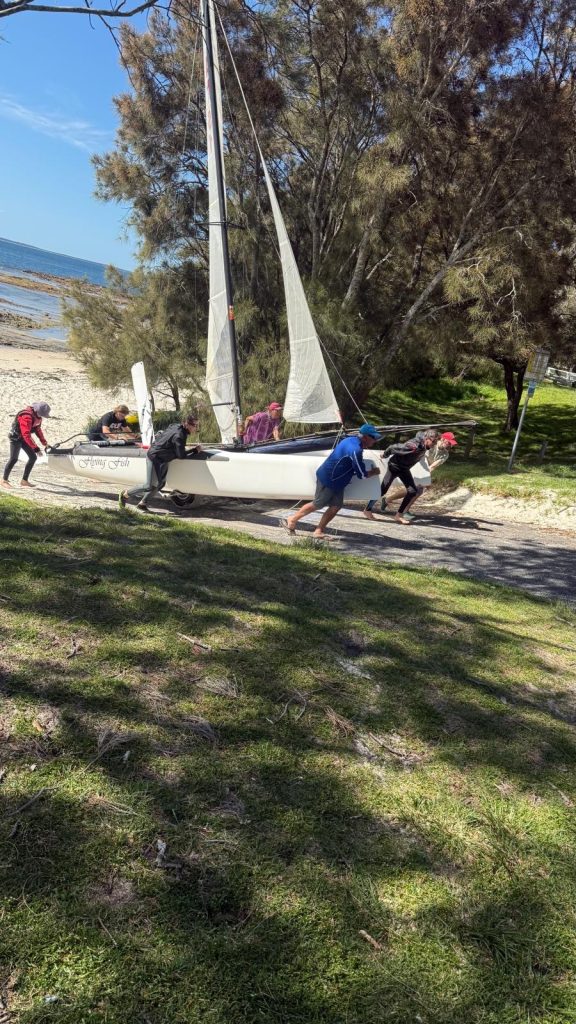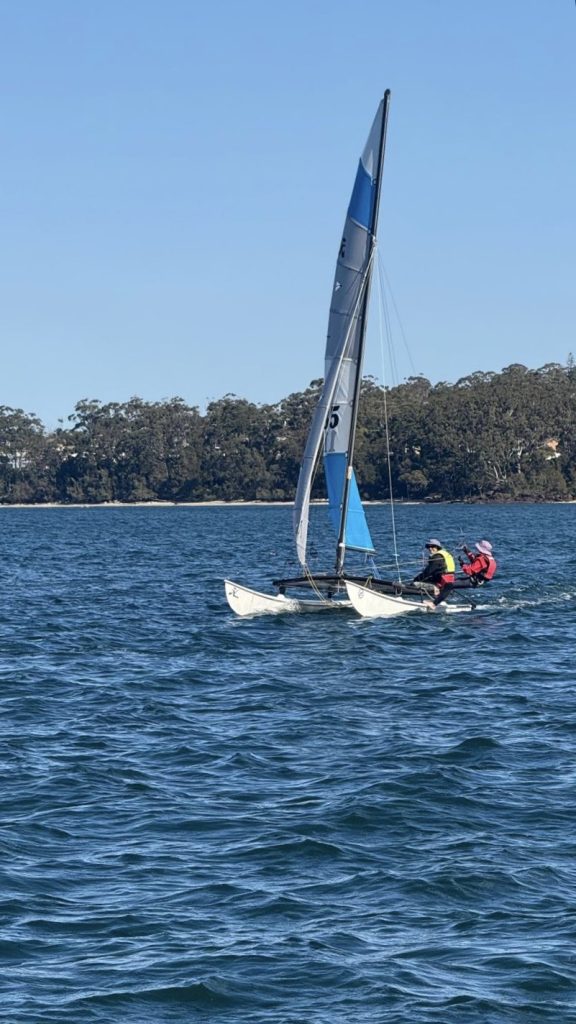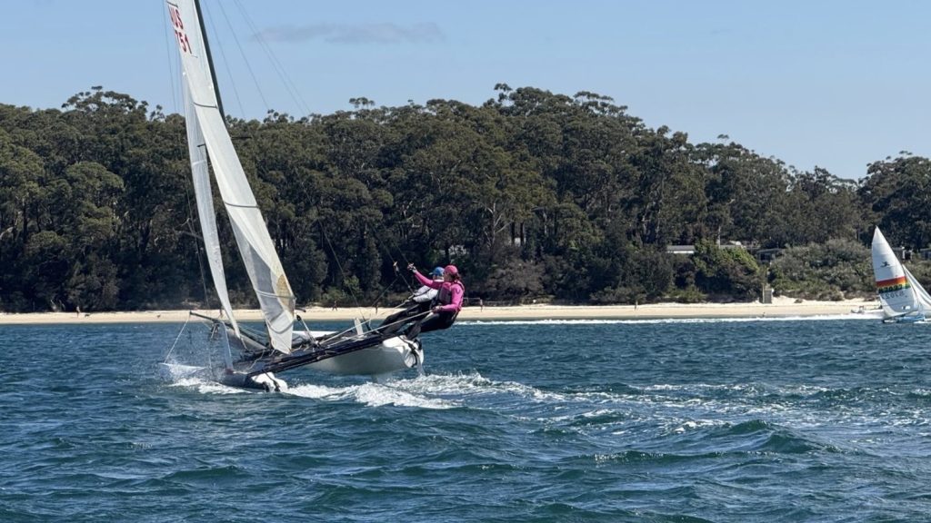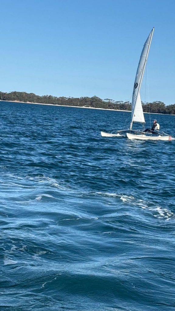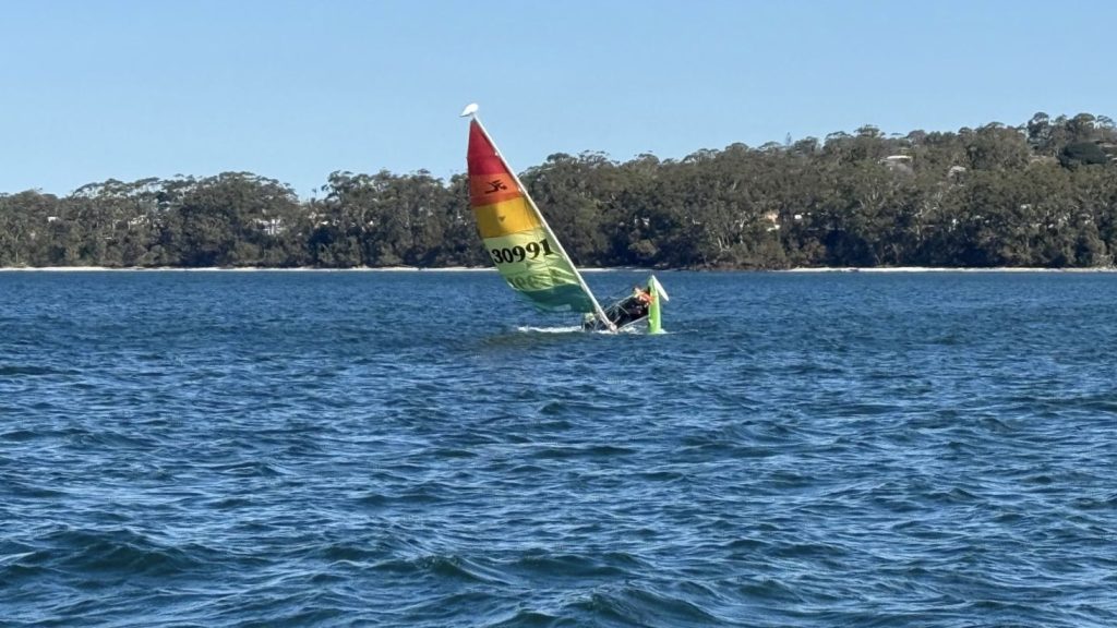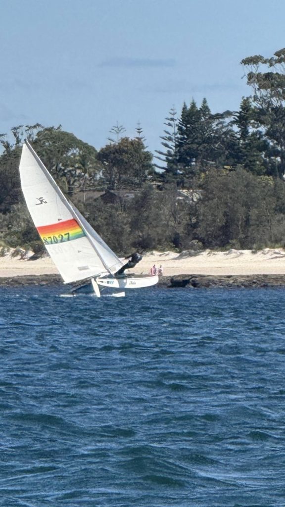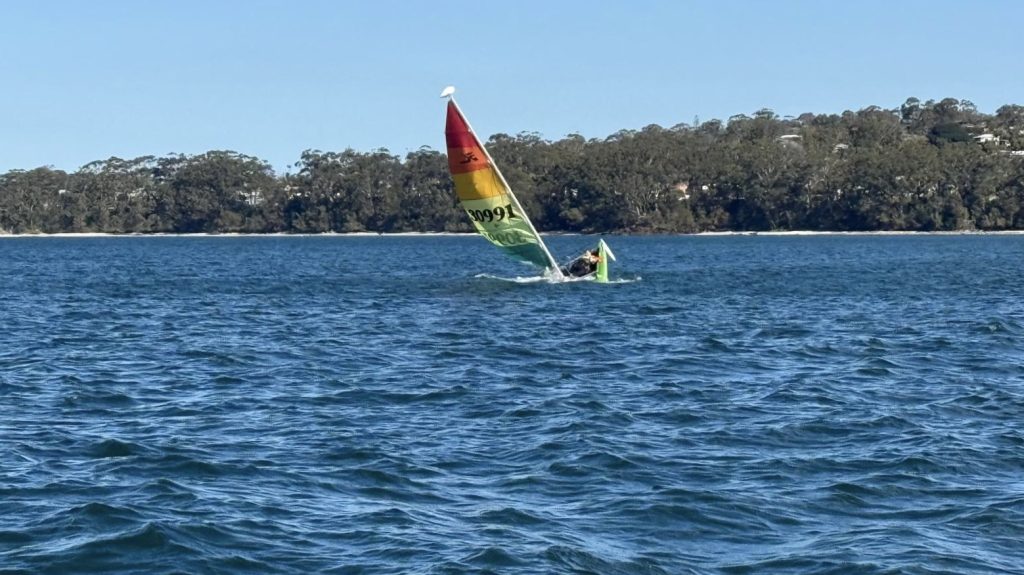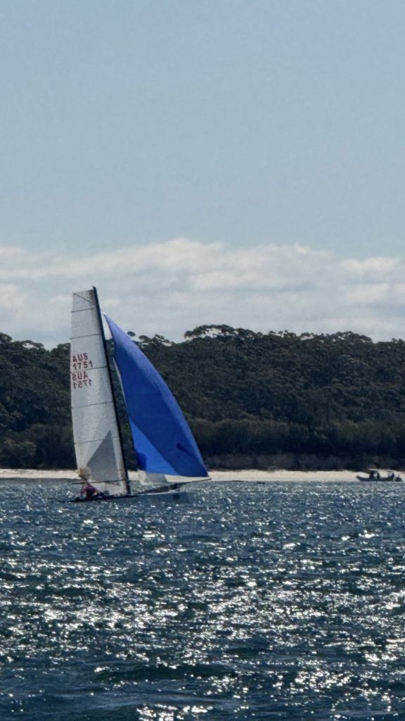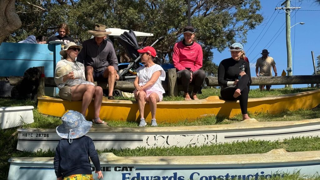 After a fabulous lunch cooked by club legends Oliver Lawson and Hannah de Rooy, we headed out for a second go at the Round the Bay Rally. With the wind shifting further west, the duty officer decided to reverse the course, which was better suited to the conditions. In the fresh westerly, competitors were challenged to keep their boats flat through the bullets and moving in the lulls — as Bridget and Charlie discovered while “tea-bagging” their way to Huskisson.