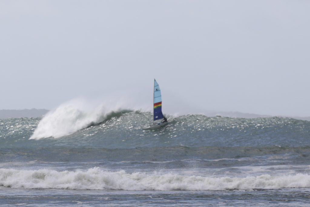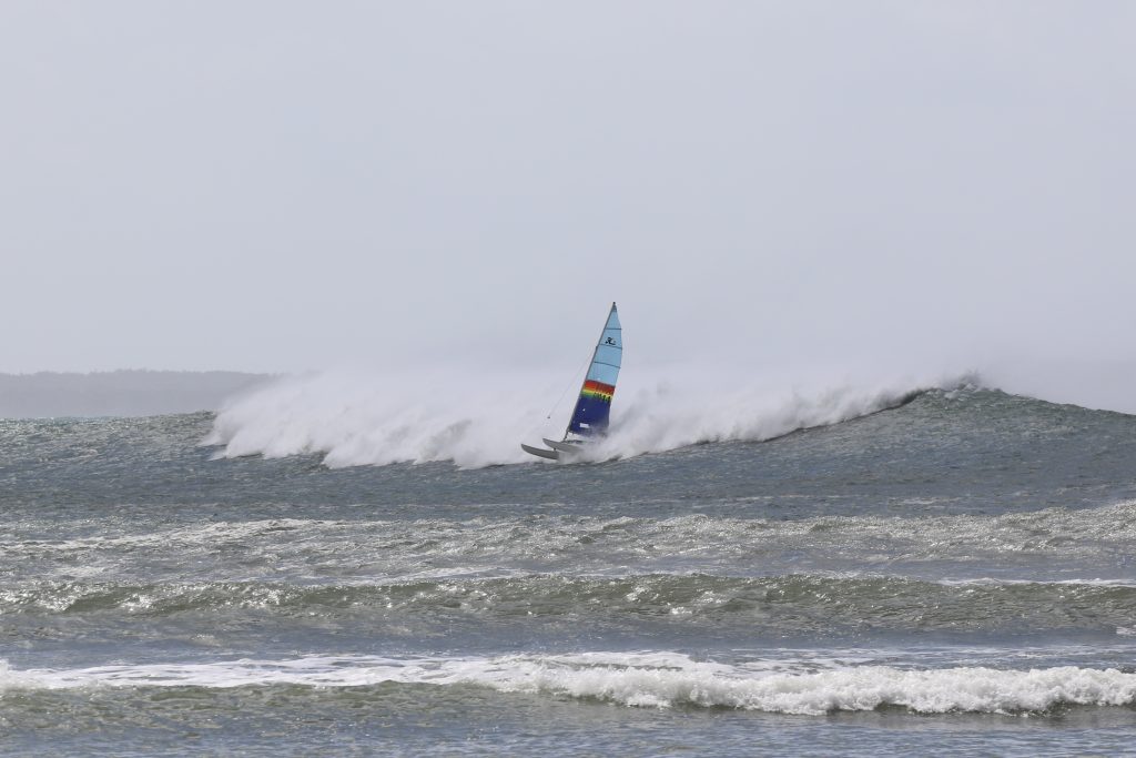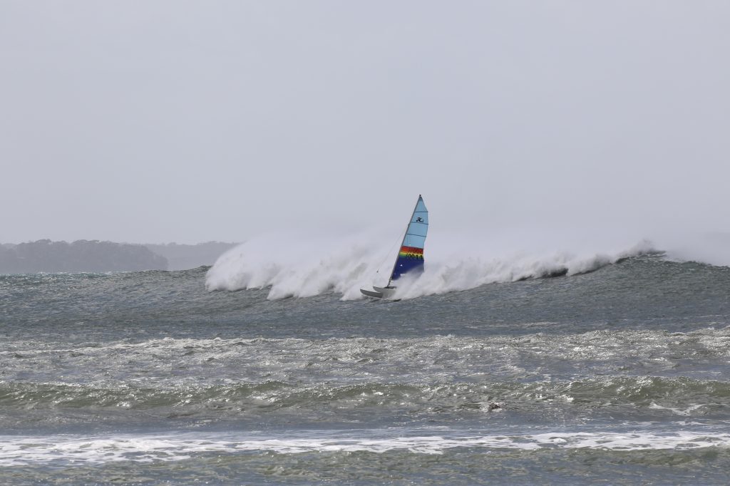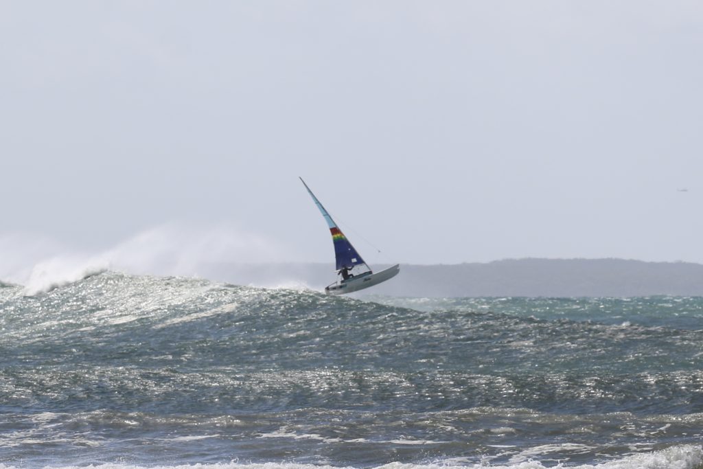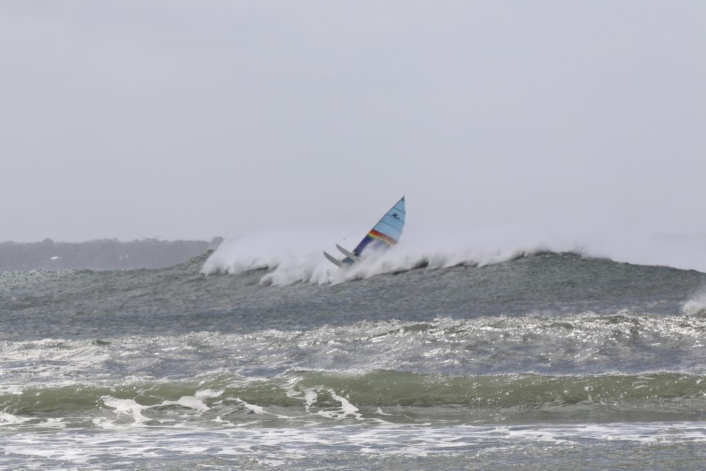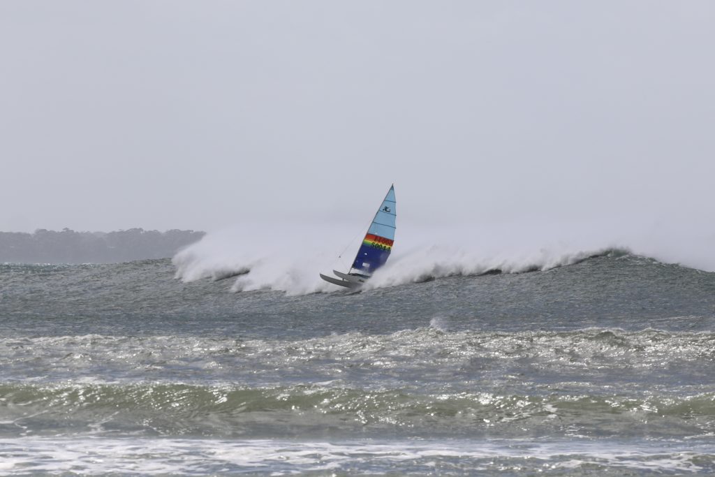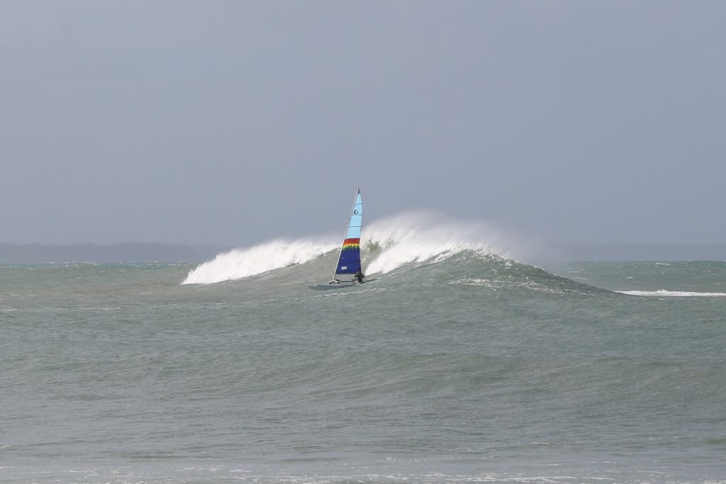 Last week, the east coast was lit up with over 6-metre waves hitting the coastline from the south-east. And with over 30+ knots of wind blowing along with it, there was only one craft that was up for the task … the humble Hobie 14. However, there were only two boys mad enough to take their boats out: Andrew Spinelli and Paddy Butler.