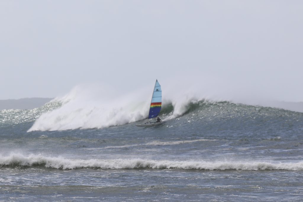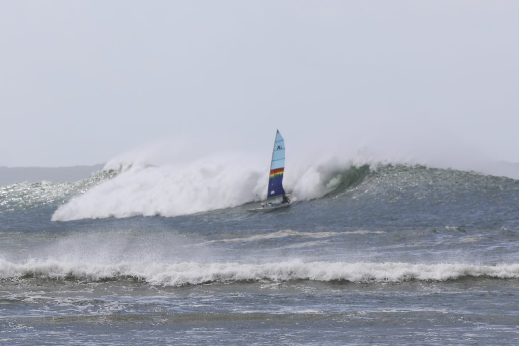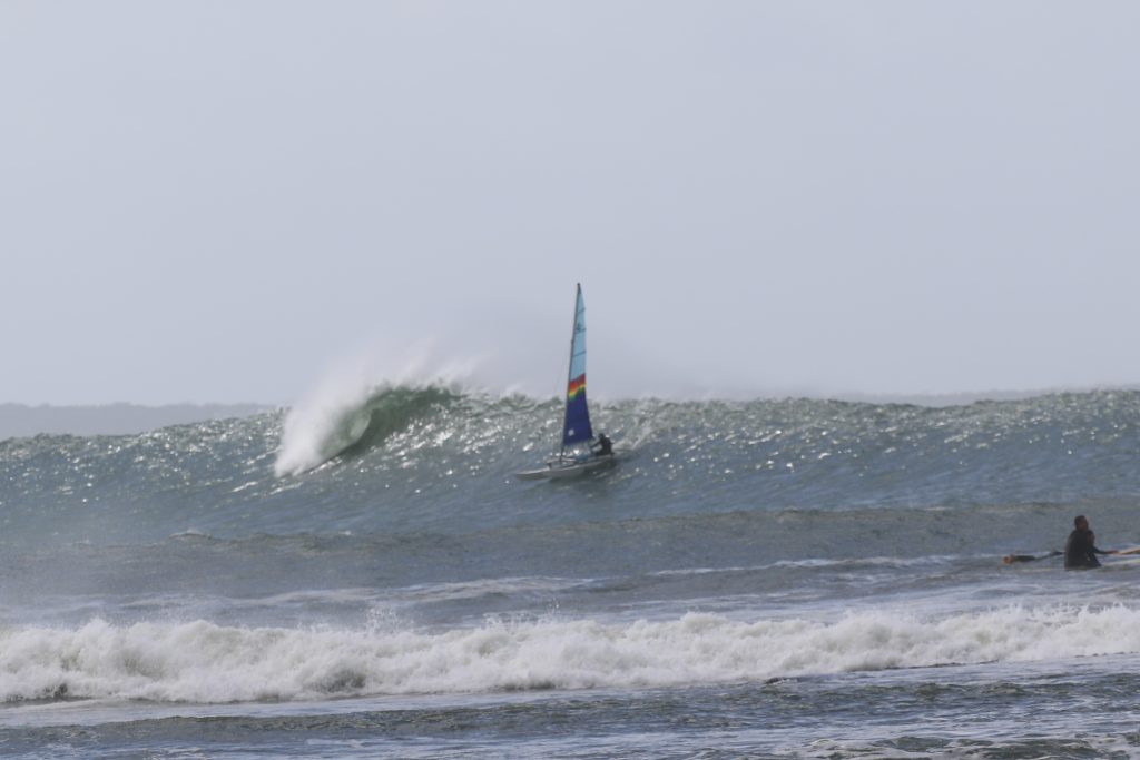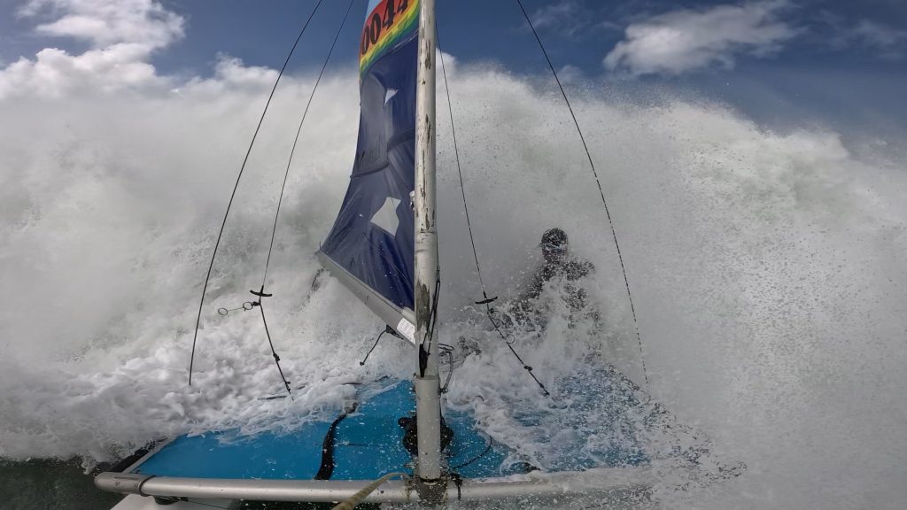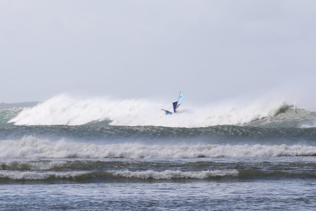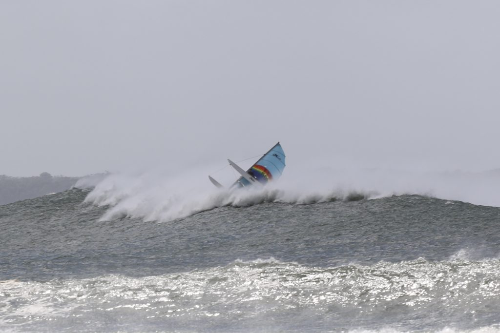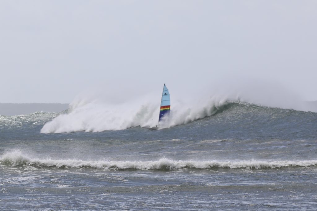 Last week, the east coast was lit up with over 6-metre waves hitting the coastline from the south-east. And with over 30+ knots of wind blowing along with it, there was only one craft that was up for the task … the humble Hobie 14. However, there were only two boys mad enough to take their boats out: Andrew Spinelli and Paddy Butler.