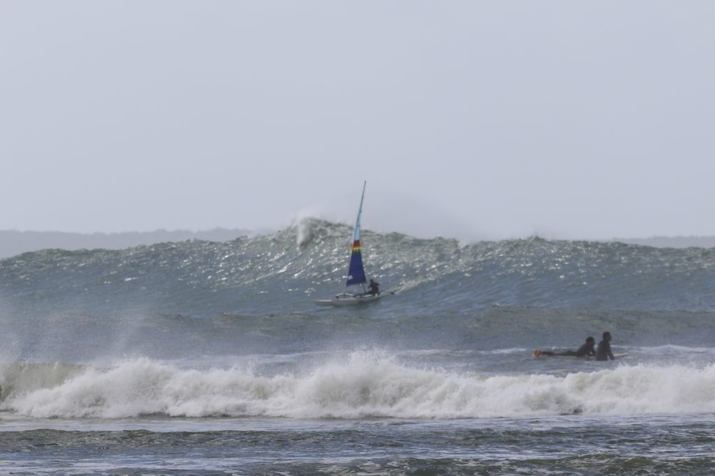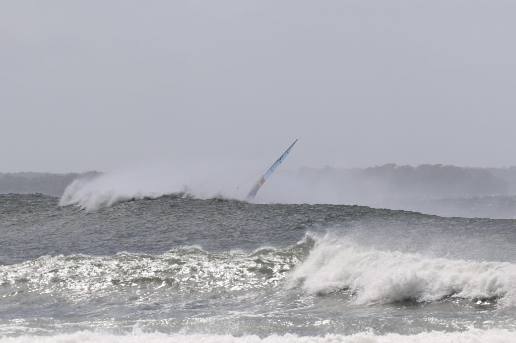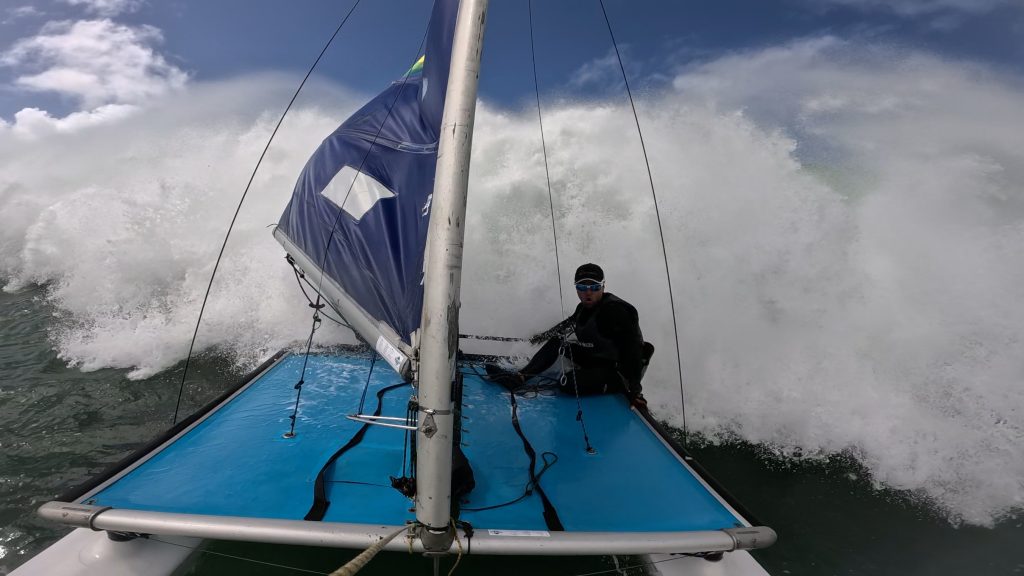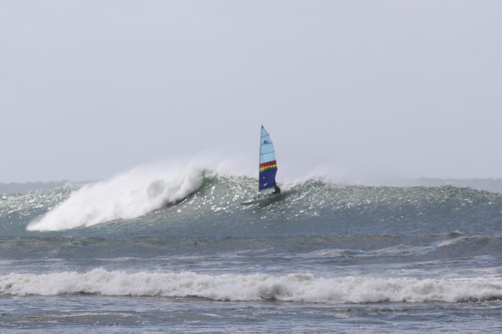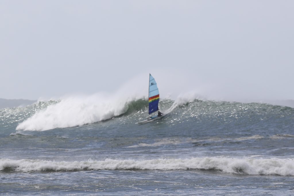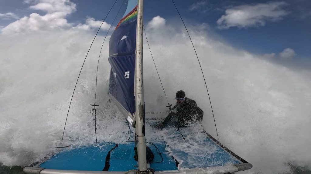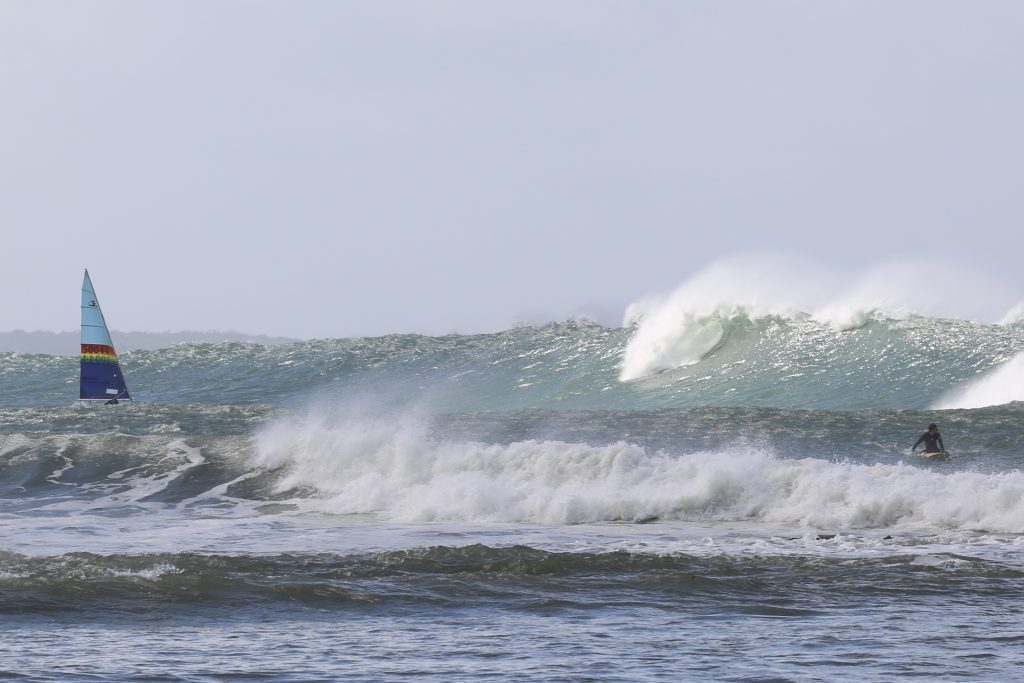 Last week, the east coast was lit up with over 6-metre waves hitting the coastline from the south-east. And with over 30+ knots of wind blowing along with it, there was only one craft that was up for the task … the humble Hobie 14. However, there were only two boys mad enough to take their boats out: Andrew Spinelli and Paddy Butler.